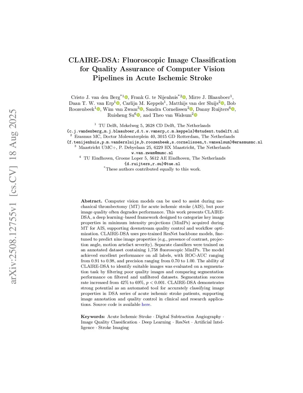 CLAIRE-DSA: Fluoroscopic Image Classification for Quality Assurance of Computer Vision Pipelines in Acute Ischemic Stroke