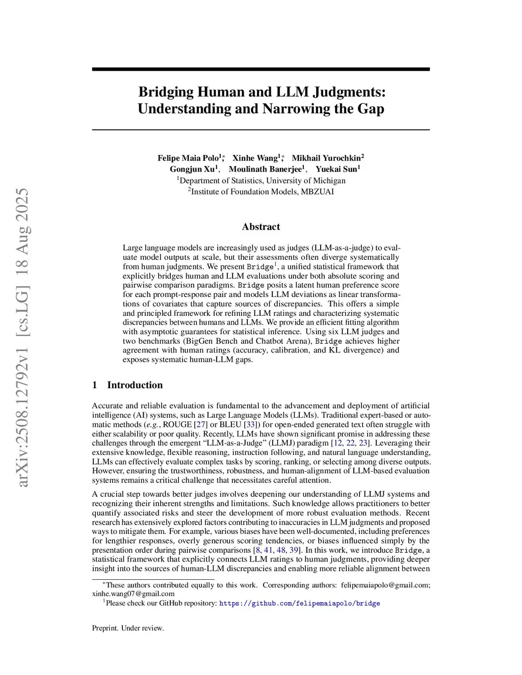Large language models are increasingly used as judges (LLM-as-a-judge) to evaluate model outputs at scale, but their assessments often diverge systematically from human judgments. We present Bridge, a unified statistical framework that explicitly bridges human and LLM evaluations under both absolute scoring and pairwise comparison paradigms. Bridge posits a latent human preference score for each prompt-response pair and models LLM deviations as linear transformations of covariates that capture sources of discrepancies. This offers a simple and principled framework for refining LLM ratings and characterizing systematic discrepancies between humans and LLMs. We provide an efficient fitting algorithm with asymptotic guarantees for statistical inference. Using six LLM judges and two benchmarks (BigGen Bench and Chatbot Arena), Bridge achieves higher agreement with human ratings (accuracy, calibration, and KL divergence) and exposes systematic human-LLM gaps.
