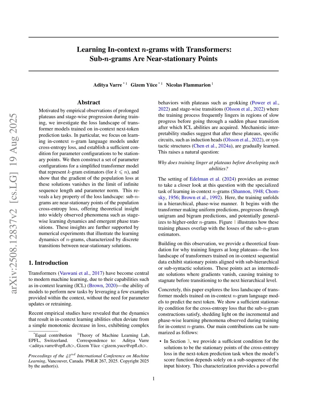 Learning In-context n-grams with Transformers: Sub-n-grams Are Near-stationary Points