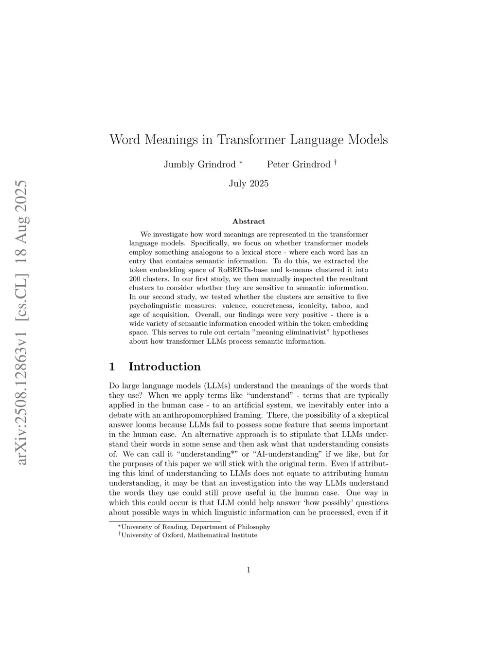 We investigate how word meanings are represented in the transformer language models. Specifically, we focus on whether transformer models employ something analogous to a lexical store - where each word has an entry that contains semantic information. To do this, we extracted the token embedding space of RoBERTa-base and k-means clustered it into 200 clusters. In our first study, we then manually inspected the resultant clusters to consider whether they are sensitive to semantic information. In our second study, we tested whether the clusters are sensitive to five psycholinguistic measures: valence, concreteness, iconicity, taboo, and age of acquisition. Overall, our findings were very positive - there is a wide variety of semantic information encoded within the token embedding space. This serves to rule out certain "meaning eliminativist" hypotheses about how transformer LLMs process semantic information.