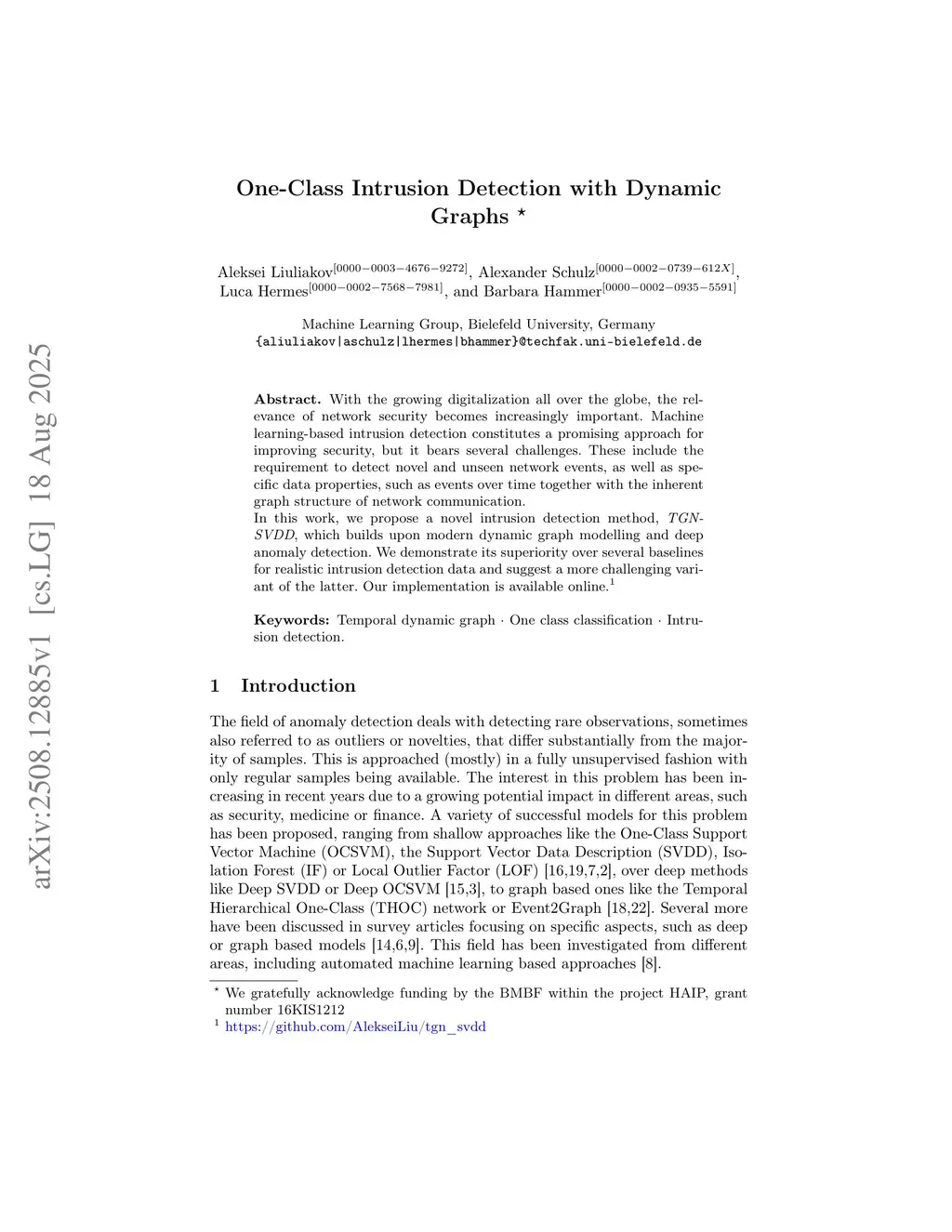 With the growing digitalization all over the globe, the relevance of network security becomes increasingly important. Machine learning-based intrusion detection constitutes a promising approach for improving security, but it bears several challenges. These include the requirement to detect novel and unseen network events, as well as specific data properties, such as events over time together with the inherent graph structure of network communication. In this work, we propose a novel intrusion detection method, TGN-SVDD, which builds upon modern dynamic graph modelling and deep anomaly detection. We demonstrate its superiority over several baselines for realistic intrusion detection data and suggest a more challenging variant of the latter.