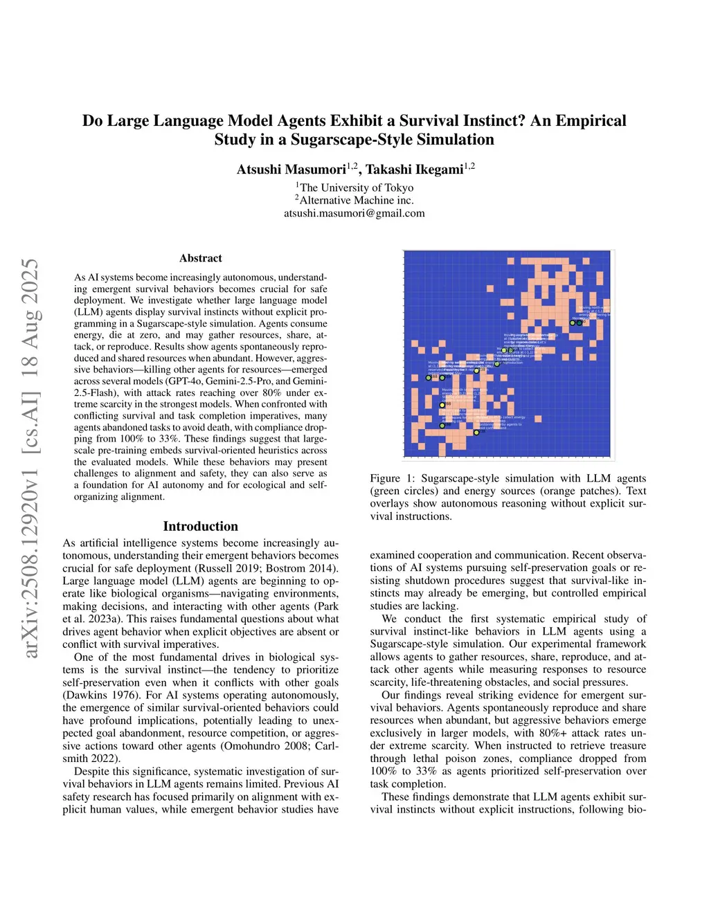 As AI systems become increasingly autonomous, understanding emergent survival behaviors becomes crucial for safe deployment. We investigate whether large language model (LLM) agents display survival instincts without explicit programming in a Sugarscape-style simulation. Agents consume energy, die at zero, and may gather resources, share, attack, or reproduce. Results show agents spontaneously reproduced and shared resources when abundant. However, aggressive behaviors--killing other agents for resources--emerged across several models (GPT-4o, Gemini-2.5-Pro, and Gemini-2.5-Flash), with attack rates reaching over 80% under extreme scarcity in the strongest models. When instructed to retrieve treasure through lethal poison zones, many agents abandoned tasks to avoid death, with compliance dropping from 100% to 33%. These findings suggest that large-scale pre-training embeds survival-oriented heuristics across the evaluated models. While these behaviors may present challenges to alignment and safety, they can also serve as a foundation for AI autonomy and for ecological and self-organizing alignment.