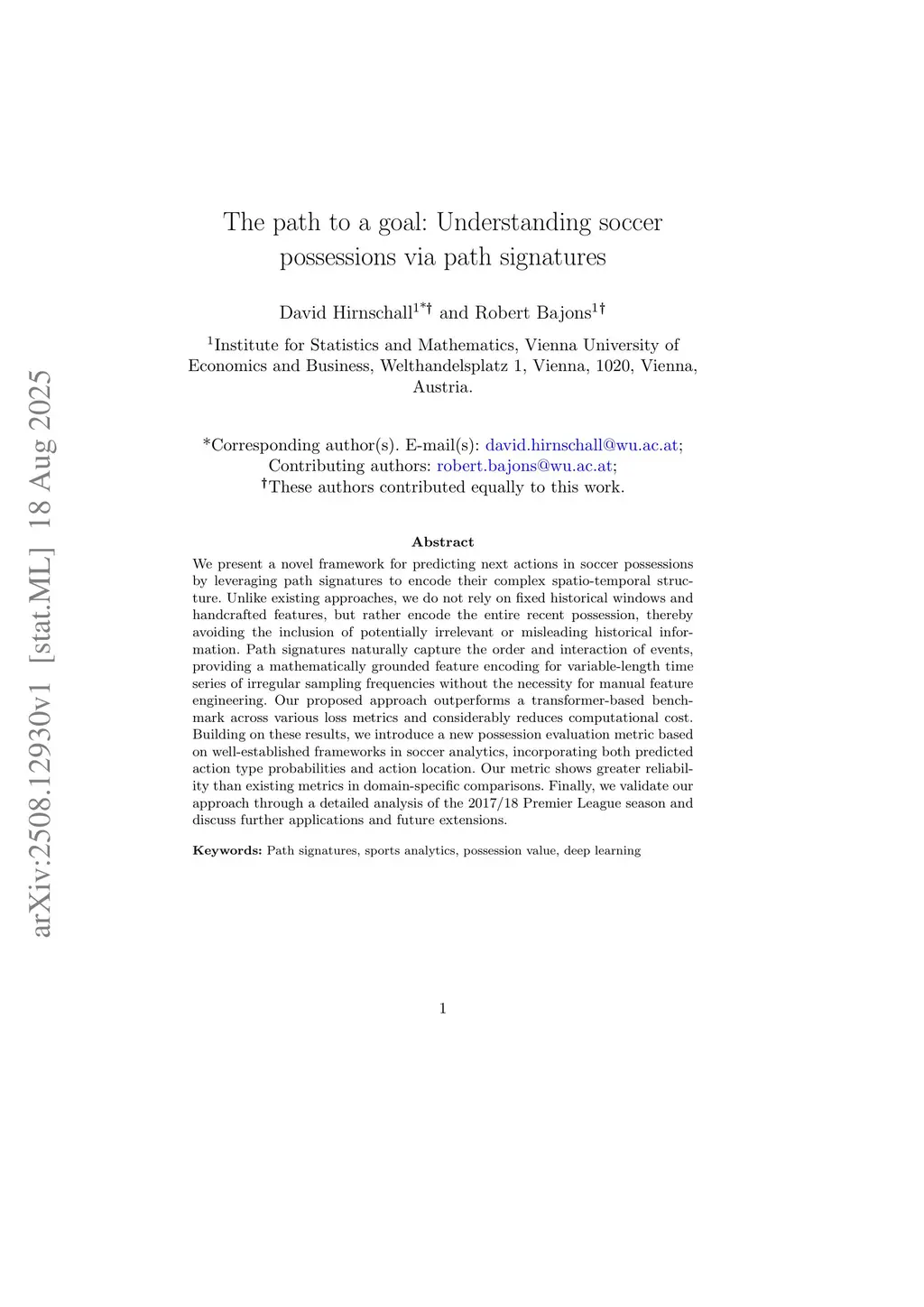 We present a novel framework for predicting next actions in soccer possessions by leveraging path signatures to encode their complex spatio-temporal structure. Unlike existing approaches, we do not rely on fixed historical windows and handcrafted features, but rather encode the entire recent possession, thereby avoiding the inclusion of potentially irrelevant or misleading historical information. Path signatures naturally capture the order and interaction of events, providing a mathematically grounded feature encoding for variable-length time series of irregular sampling frequencies without the necessity for manual feature engineering. Our proposed approach outperforms a transformer-based benchmark across various loss metrics and considerably reduces computational cost. Building on these results, we introduce a new possession evaluation metric based on well-established frameworks in soccer analytics, incorporating both predicted action type probabilities and action location. Our metric shows greater reliability than existing metrics in domain-specific comparisons. Finally, we validate our approach through a detailed analysis of the 2017/18 Premier League season and discuss further applications and future extensions.