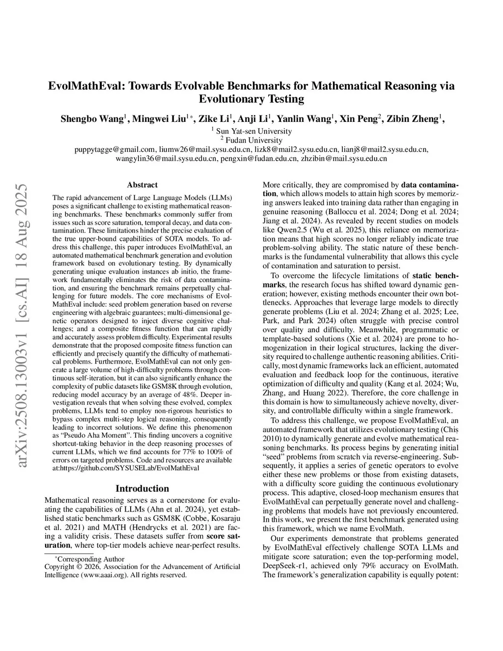 The rapid advancement of Large Language Models (LLMs) poses a significant challenge to existing mathematical reasoning benchmarks. However, these benchmarks tend to become easier over time as LLMs can learn from the published benchmarks. This limitation hinder the precise evaluation of the true capabilities of SOTA models. To address this challenge, this paper introduces EvolMathEval, an automated mathematical benchmark generation and evolution framework based on evolutionary testing. Experimental results demonstrate that EvolMathEval can not only generate a large volume of high-difficulty problems through continuous self-iteration, but it can also significantly enhance the complexity of public datasets like GSM8K through evolution, reducing model accuracy by an average of 48\%. Deeper investigation reveals that when solving these evolved problems, LLMs tend to bypass complex multi-step logical reasoning by relying on simplistic and fuzzy conditions, consequently leading to incorrect solutions. We define this phenomenon as the ``Pseudo Aha Moment", which we find accounts for 77\% to 100\% of errors on targeted problems. Code and resources are available at:this https URL