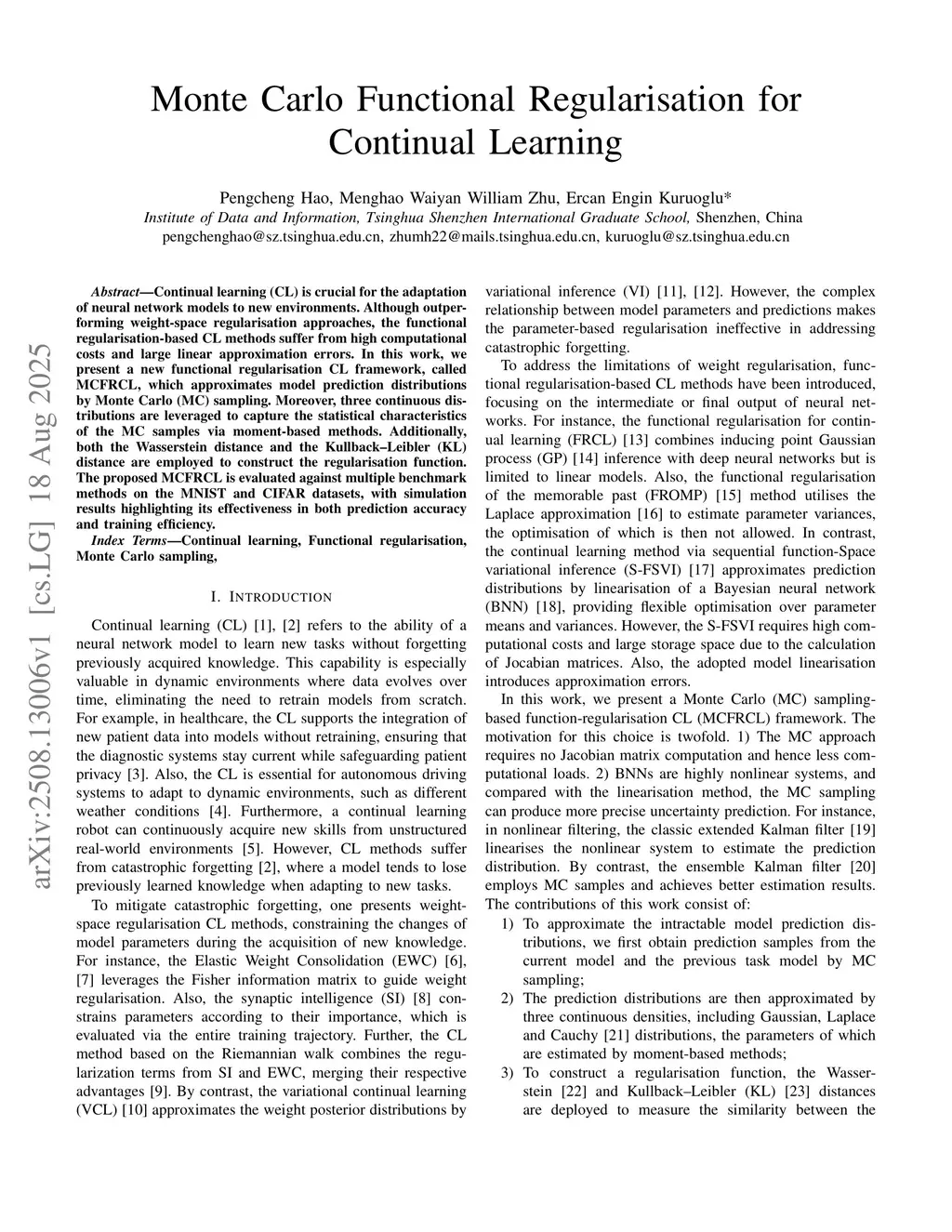 Continual learning (CL) is crucial for the adaptation of neural network models to new environments. Although outperforming weight-space regularisation approaches, the functional regularisation-based CL methods suffer from high computational costs and large linear approximation errors. In this work, we present a new functional regularisation CL framework, called MCFRCL, which approximates model prediction distributions by Monte Carlo (MC) sampling. Moreover, three continuous distributions are leveraged to capture the statistical characteristics of the MC samples via moment-based methods. Additionally, both the Wasserstein distance and the Kullback-Leibler (KL) distance are employed to construct the regularisation function. The proposed MCFRCL is evaluated against multiple benchmark methods on the MNIST and CIFAR datasets, with simulation results highlighting its effectiveness in both prediction accuracy and training efficiency.