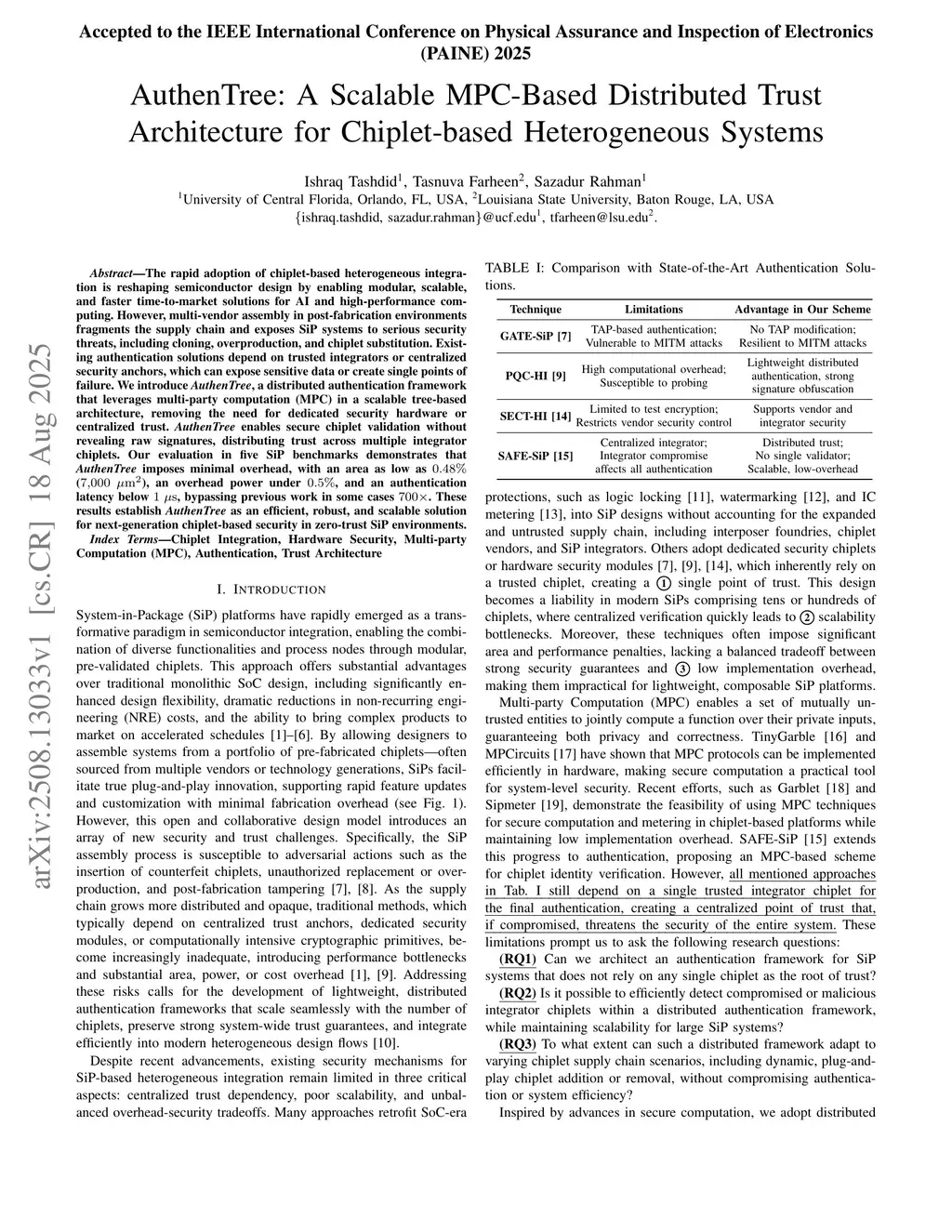 The rapid adoption of chiplet-based heterogeneous integration is reshaping semiconductor design by enabling modular, scalable, and faster time-to-market solutions for AI and high-performance computing. However, multi-vendor assembly in post-fabrication environments fragments the supply chain and exposes SiP systems to serious security threats, including cloning, overproduction, and chiplet substitution. Existing authentication solutions depend on trusted integrators or centralized security anchors, which can expose sensitive data or create single points of failure. We introduce AuthenTree, a distributed authentication framework that leverages multi-party computation (MPC) in a scalable tree-based architecture, removing the need for dedicated security hardware or centralized trust. AuthenTree enables secure chiplet validation without revealing raw signatures, distributing trust across multiple integrator chiplets. Our evaluation in five SiP benchmarks demonstrates that AuthenTree imposes minimal overhead, with an area as low as 0.48% (7,000 sq-micrometers), an overhead power under 0.5%, and an authentication latency below 1 microsecond, surpassing previous work in some cases by 700 times. These results establish AuthenTree as an efficient, robust, and scalable solution for next-generation chiplet-based security in zero-trust SiP environments.