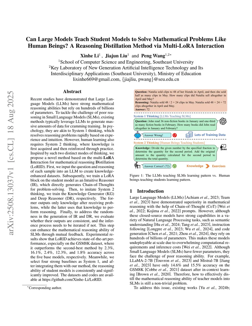 Recent studies have demonstrated that Large Language Models (LLMs) have strong mathematical reasoning abilities but rely on hundreds of billions of parameters. To tackle the challenge of poor reasoning in Small Language Models (SLMs), existing methods typically leverage LLMs to generate massive amounts of data for cramming training. In psychology, they are akin to System 1 thinking, which resolves reasoning problems rapidly based on experience and intuition. However, human learning also requires System 2 thinking, where knowledge is first acquired and then reinforced through practice. Inspired by such two distinct modes of thinking, we propose a novel method based on the multi-LoRA Interaction for mathematical reasoning Distillation (LoRID). First, we input the question and reasoning of each sample into an LLM to create knowledge-enhanced datasets. Subsequently, we train a LoRA block on the student model as an Intuitive Reasoner (IR), which directly generates Chain-of-Thoughts for problem-solving. Then, to imitate System 2 thinking, we train the Knowledge Generator (KG) and Deep Reasoner (DR), respectively. The former outputs only knowledge after receiving problems, while the latter uses that knowledge to perform reasoning. Finally, to address the randomness in the generation of IR and DR, we evaluate whether their outputs are consistent, and the inference process needs to be iterated if not. This step can enhance the mathematical reasoning ability of SLMs through mutual feedback. Experimental results show that LoRID achieves state-of-the-art performance, especially on the GSM8K dataset, where it outperforms the second-best method by 2.3%, 16.1%, 2.4%, 12.3%, and 1.8% accuracy across the five base models, respectively.