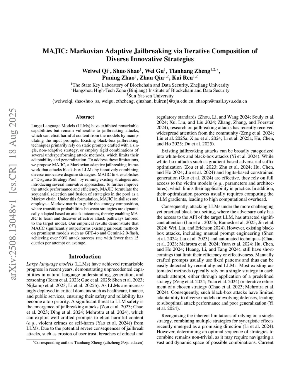 Large Language Models (LLMs) have exhibited remarkable capabilities but remain vulnerable to jailbreaking attacks, which can elicit harmful content from the models by manipulating the input prompts. Existing black-box jailbreaking techniques primarily rely on static prompts crafted with a single, non-adaptive strategy, or employ rigid combinations of several underperforming attack methods, which limits their adaptability and generalization. To address these limitations, we propose MAJIC, a Markovian adaptive jailbreaking framework that attacks black-box LLMs by iteratively combining diverse innovative disguise strategies. MAJIC first establishes a ``Disguise Strategy Pool'' by refining existing strategies and introducing several innovative approaches. To further improve the attack performance and efficiency, MAJIC formulate the sequential selection and fusion of strategies in the pool as a Markov chain. Under this formulation, MAJIC initializes and employs a Markov matrix to guide the strategy composition, where transition probabilities between strategies are dynamically adapted based on attack outcomes, thereby enabling MAJIC to learn and discover effective attack pathways tailored to the target model. Our empirical results demonstrate that MAJIC significantly outperforms existing jailbreak methods on prominent models such as GPT-4o and Gemini-2.0-flash, achieving over 90\% attack success rate with fewer than 15 queries per attempt on average.