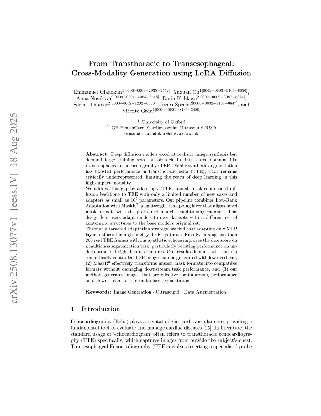 Deep diffusion models excel at realistic image synthesis but demand large training sets-an obstacle in data-scarce domains like transesophageal echocardiography (TEE). While synthetic augmentation has boosted performance in transthoracic echo (TTE), TEE remains critically underrepresented, limiting the reach of deep learning in this high-impact modality.We address this gap by adapting a TTE-trained, mask-conditioned diffusion backbone to TEE with only a limited number of new cases and adapters as small as parameters. Our pipeline combines Low-Rank Adaptation with MaskR, a lightweight remapping layer that aligns novel mask formats with the pretrained model's conditioning channels. This design lets users adapt models to new datasets with a different set of anatomical structures to the base model's original set.Through a targeted adaptation strategy, we find that adapting only MLP layers suffices for high-fidelity TEE synthesis. Finally, mixing less than 200 real TEE frames with our synthetic echoes improves the dice score on a multiclass segmentation task, particularly boosting performance on underrepresented right-heart structures. Our results demonstrate that (1) semantically controlled TEE images can be generated with low overhead, (2) MaskR effectively transforms unseen mask formats into compatible formats without damaging downstream task performance, and (3) our method generates images that are effective for improving performance on a downstream task of multiclass segmentation.
