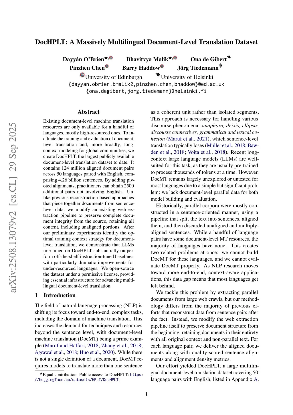 Existing document-level machine translation resources are only available for a handful of languages, mostly high-resourced ones. To facilitate the training and evaluation of document-level translation and, more broadly, long-context modeling for global communities, we create DocHPLT, the largest publicly available document-level translation dataset to date. It contains 124 million aligned document pairs across 50 languages paired with English, comprising 4.26 billion sentences. By adding pivoted alignments, practitioners can obtain 2500 additional pairs not involving English. Unlike previous reconstruction-based approaches that piece together documents from sentence-level data, we modify an existing web extraction pipeline to preserve complete document integrity from the source, retaining all content, including unaligned portions. After our preliminary experiments identify the optimal training context strategy for document-level translation, we demonstrate that LLMs fine-tuned on DocHPLT substantially outperform off-the-shelf instruction-tuned baselines, with particularly dramatic improvements for under-resourced languages. We open-source the dataset under a permissive license, providing essential infrastructure for advancing multilingual document-level translation.