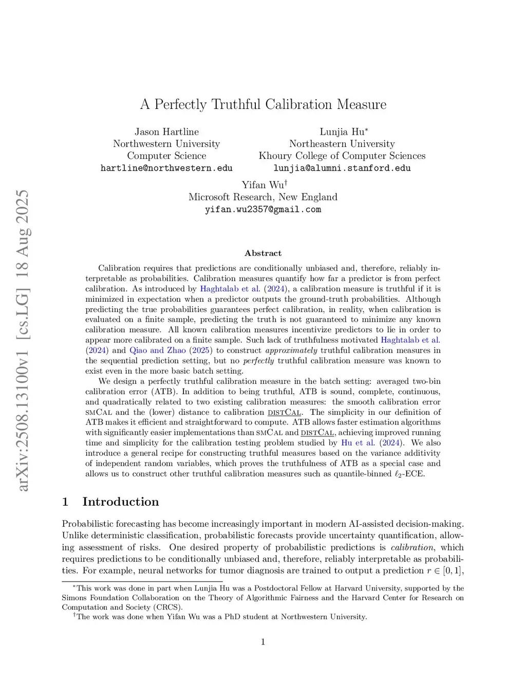 Calibration requires that predictions are conditionally unbiased and, therefore, reliably interpretable as probabilities. A calibration measure quantifies how far a predictor is from perfect calibration. As introduced by Haghtalab et al. (2024), a calibration measure is truthful if it is minimized in expectation when a predictor outputs the ground-truth probabilities. Predicting the true probabilities guarantees perfect calibration, but in reality, when calibration is evaluated on a random sample, all known calibration measures incentivize predictors to lie in order to appear more calibrated. Such lack of truthfulness motivated Haghtalab et al. (2024) and Qiao and Zhao (2025) to construct approximately truthful calibration measures in the sequential prediction setting, but no perfectly truthful calibration measure was known to exist even in the more basic batch setting.We design a simple, perfectly and strictly truthful, sound and complete calibration measure in the batch setting: averaged two-bin calibration error (ATB). ATB is quadratically related to two existing calibration measures: the smooth calibration error smCal and the lower distance to calibration distCal. The simplicity in our definition of ATB makes it efficient and straightforward to compute, allowing us to give the first linear-time calibration testing algorithm, improving a result of Hu et al. (2024). We also introduce a general recipe for constructing truthful measures based on the variance additivity of independent random variables, which proves the truthfulness of ATB as a special case and allows us to construct other truthful calibration measures such as quantile-binned l_2-ECE.