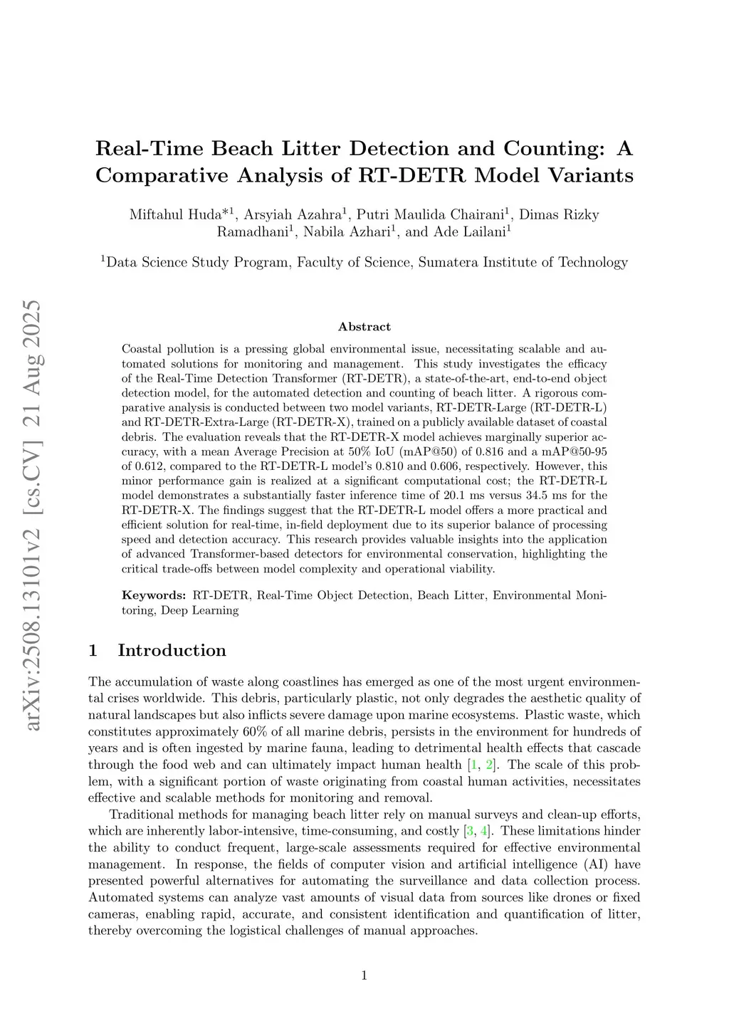 Coastal pollution is a pressing global environmental issue, necessitating scalable and automated solutions for monitoring and management. This study investigates the efficacy of the Real-Time Detection Transformer (RT-DETR), a state-of-the-art, end-to-end object detection model, for the automated detection and counting of beach litter. A rigorous comparative analysis is conducted between two model variants, RT-DETR-Large (RT-DETR-L) and RT-DETR-Extra-Large (RT-DETR-X), trained on a publicly available dataset of coastal debris. The evaluation reveals that the RT-DETR-X model achieves marginally superior accuracy, with a mean Average Precision at 50\% IoU (mAP@50) of 0.816 and a mAP@50-95 of 0.612, compared to the RT-DETR-L model's 0.810 and 0.606, respectively. However, this minor performance gain is realized at a significant computational cost; the RT-DETR-L model demonstrates a substantially faster inference time of 20.1 ms versus 34.5 ms for the RT-DETR-X. The findings suggest that the RT-DETR-L model offers a more practical and efficient solution for real-time, in-field deployment due to its superior balance of processing speed and detection accuracy. This research provides valuable insights into the application of advanced Transformer-based detectors for environmental conservation, highlighting the critical trade-offs between model complexity and operational viability.