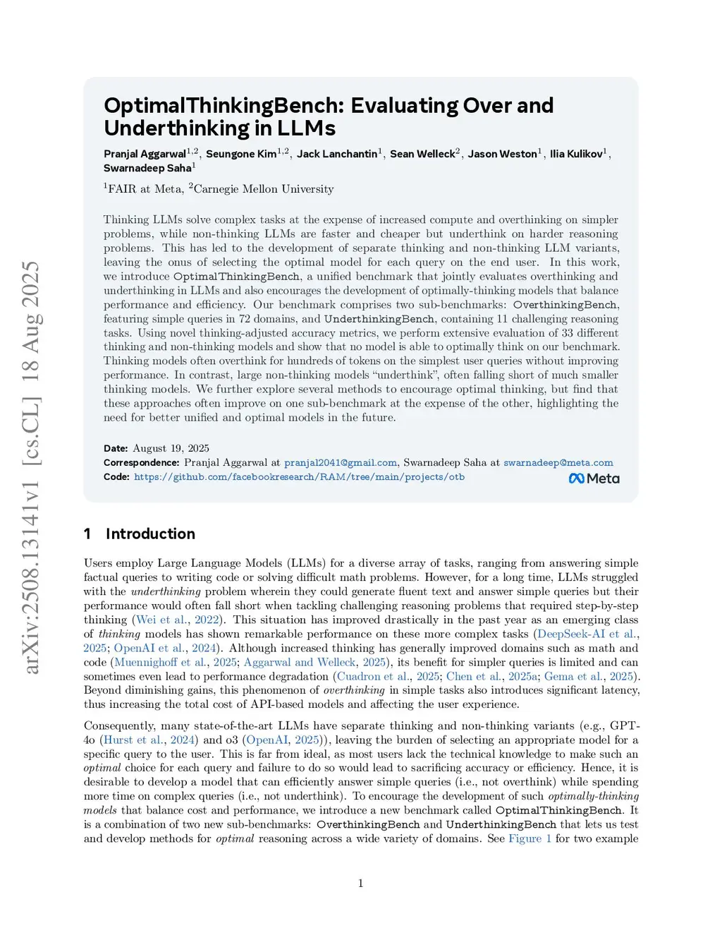 Thinking LLMs solve complex tasks at the expense of increased compute and overthinking on simpler problems, while non-thinking LLMs are faster and cheaper but underthink on harder reasoning problems. This has led to the development of separate thinking and non-thinking LLM variants, leaving the onus of selecting the optimal model for each query on the end user. We introduce OptimalThinkingBench, a unified benchmark that jointly evaluates overthinking and underthinking in LLMs and also encourages the development of optimally-thinking models that balance performance and efficiency. Our benchmark comprises two sub-benchmarks: OverthinkingBench, featuring simple math and general queries in 72 domains, and UnderthinkingBench, containing 11 challenging reasoning tasks along with harder math problems. Using novel thinking-adjusted accuracy metrics, we extensively evaluate 33 different thinking and non-thinking models and show that no model is able to optimally think on our benchmark. Thinking models often overthink for hundreds of tokens on the simplest user queries without improving performance. In contrast, large non-thinking models underthink, often falling short of much smaller thinking models. We further explore several methods to encourage optimal thinking, but find that these approaches often improve on one sub-benchmark at the expense of the other, highlighting the need for better unified and optimal models in the future.