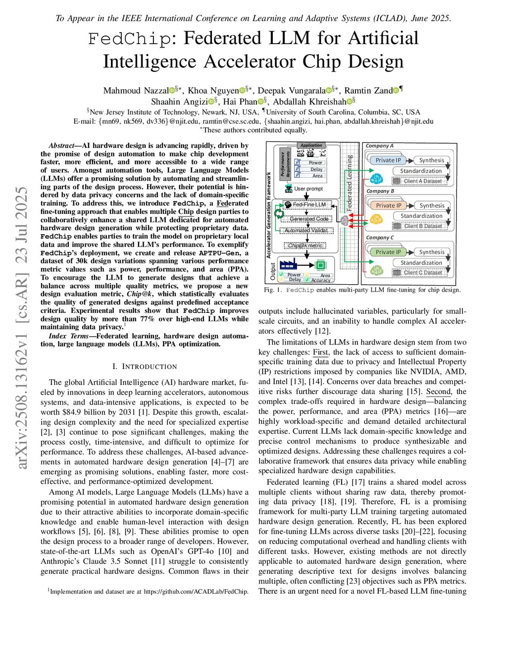 AI hardware design is advancing rapidly, driven by the promise of design automation to make chip development faster, more efficient, and more accessible to a wide range of users. Amongst automation tools, Large Language Models (LLMs) offer a promising solution by automating and streamlining parts of the design process. However, their potential is hindered by data privacy concerns and the lack of domain-specific training. To address this, we introduce FedChip, a Federated fine-tuning approach that enables multiple Chip design parties to collaboratively enhance a shared LLM dedicated for automated hardware design generation while protecting proprietary data. FedChip enables parties to train the model on proprietary local data and improve the shared LLM's performance. To exemplify FedChip's deployment, we create and release APTPU-Gen, a dataset of 30k design variations spanning various performance metric values such as power, performance, and area (PPA). To encourage the LLM to generate designs that achieve a balance across multiple quality metrics, we propose a new design evaluation metric, Chip@k, which statistically evaluates the quality of generated designs against predefined acceptance criteria. Experimental results show that FedChip improves design quality by more than 77% over high-end LLMs while maintaining data privacy