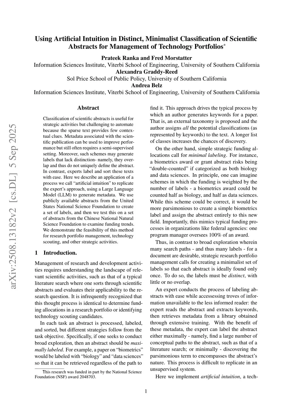 Classification of scientific abstracts is useful for strategic activities but challenging to automate because the sparse text provides few contextual clues. Metadata associated with the scientific publication can be used to improve performance but still often requires a semi-supervised setting. Moreover, such schemes may generate labels that lack distinction -- namely, they overlap and thus do not uniquely define the abstract. In contrast, experts label and sort these texts with ease. Here we describe an application of a process we call artificial intuition to replicate the expert's approach, using a Large Language Model (LLM) to generate metadata. We use publicly available abstracts from the United States National Science Foundation to create a set of labels, and then we test this on a set of abstracts from the Chinese National Natural Science Foundation to examine funding trends. We demonstrate the feasibility of this method for research portfolio management, technology scouting, and other strategic activities.