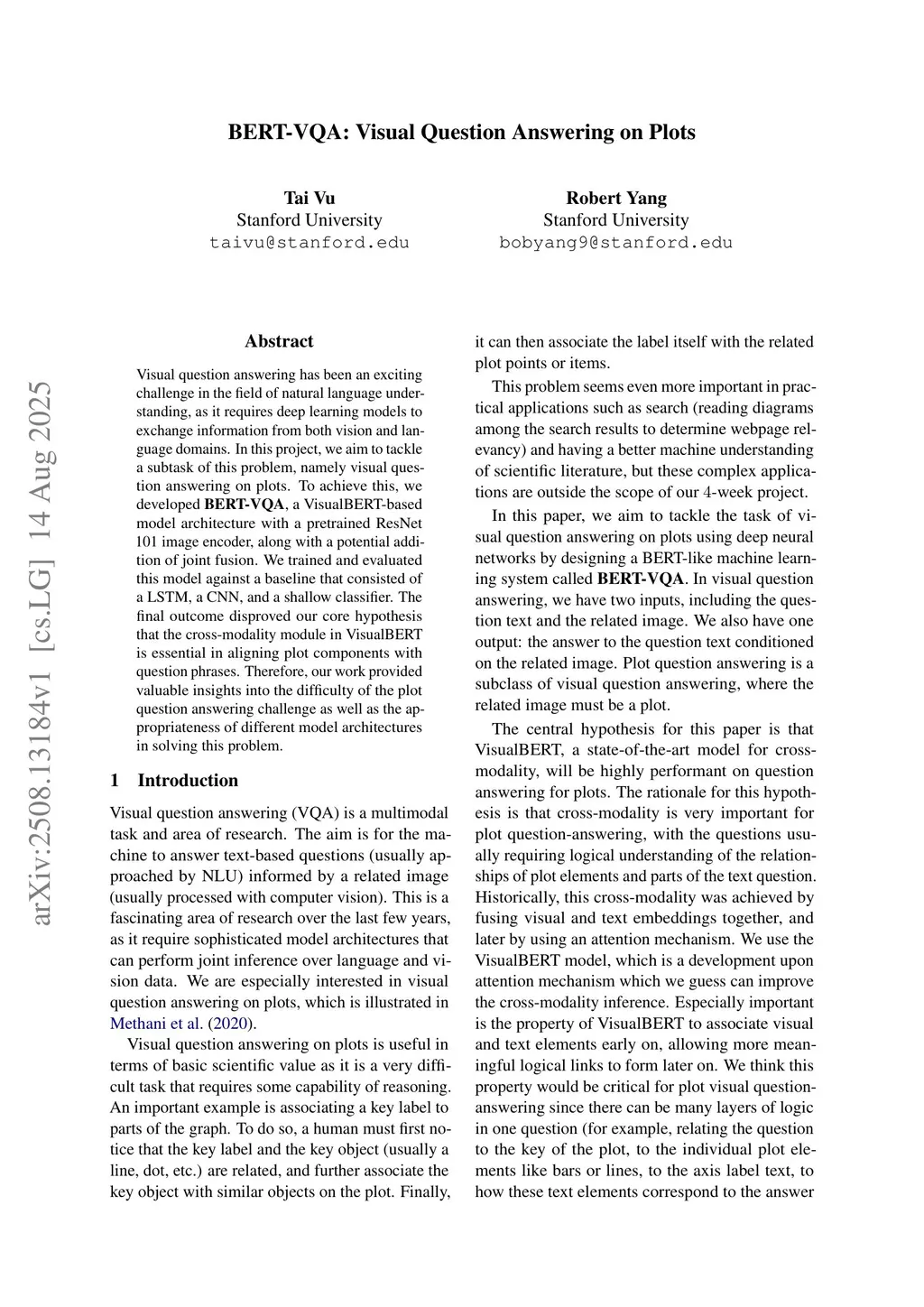 Visual question answering has been an exciting challenge in the field of natural language understanding, as it requires deep learning models to exchange information from both vision and language domains. In this project, we aim to tackle a subtask of this problem, namely visual question answering on plots. To achieve this, we developed BERT-VQA, a VisualBERT-based model architecture with a pretrained ResNet 101 image encoder, along with a potential addition of joint fusion. We trained and evaluated this model against a baseline that consisted of a LSTM, a CNN, and a shallow classifier. The final outcome disproved our core hypothesis that the cross-modality module in VisualBERT is essential in aligning plot components with question phrases. Therefore, our work provided valuable insights into the difficulty of the plot question answering challenge as well as the appropriateness of different model architectures in solving this problem.