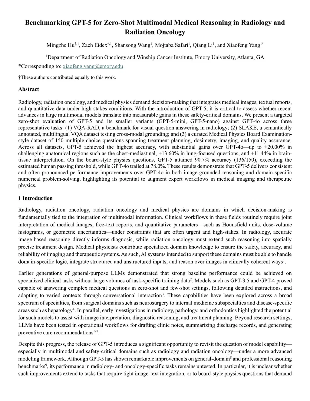 Radiology, radiation oncology, and medical physics require decision-making that integrates medical images, textual reports, and quantitative data under high-stakes conditions. With the introduction of GPT-5, it is critical to assess whether recent advances in large multimodal models translate into measurable gains in these safety-critical domains. We present a targeted zero-shot evaluation of GPT-5 and its smaller variants (GPT-5-mini, GPT-5-nano) against GPT-4o across three representative tasks. We present a targeted zero-shot evaluation of GPT-5 and its smaller variants (GPT-5-mini, GPT-5-nano) against GPT-4o across three representative tasks: (1) VQA-RAD, a benchmark for visual question answering in radiology; (2) SLAKE, a semantically annotated, multilingual VQA dataset testing cross-modal grounding; and (3) a curated Medical Physics Board Examination-style dataset of 150 multiple-choice questions spanning treatment planning, dosimetry, imaging, and quality assurance. Across all datasets, GPT-5 achieved the highest accuracy, with substantial gains over GPT-4o up to +20.00% in challenging anatomical regions such as the chest-mediastinal, +13.60% in lung-focused questions, and +11.44% in brain-tissue interpretation. On the board-style physics questions, GPT-5 attained 90.7% accuracy (136/150), exceeding the estimated human passing threshold, while GPT-4o trailed at 78.0%. These results demonstrate that GPT-5 delivers consistent and often pronounced performance improvements over GPT-4o in both image-grounded reasoning and domain-specific numerical problem-solving, highlighting its potential to augment expert workflows in medical imaging and therapeutic physics.