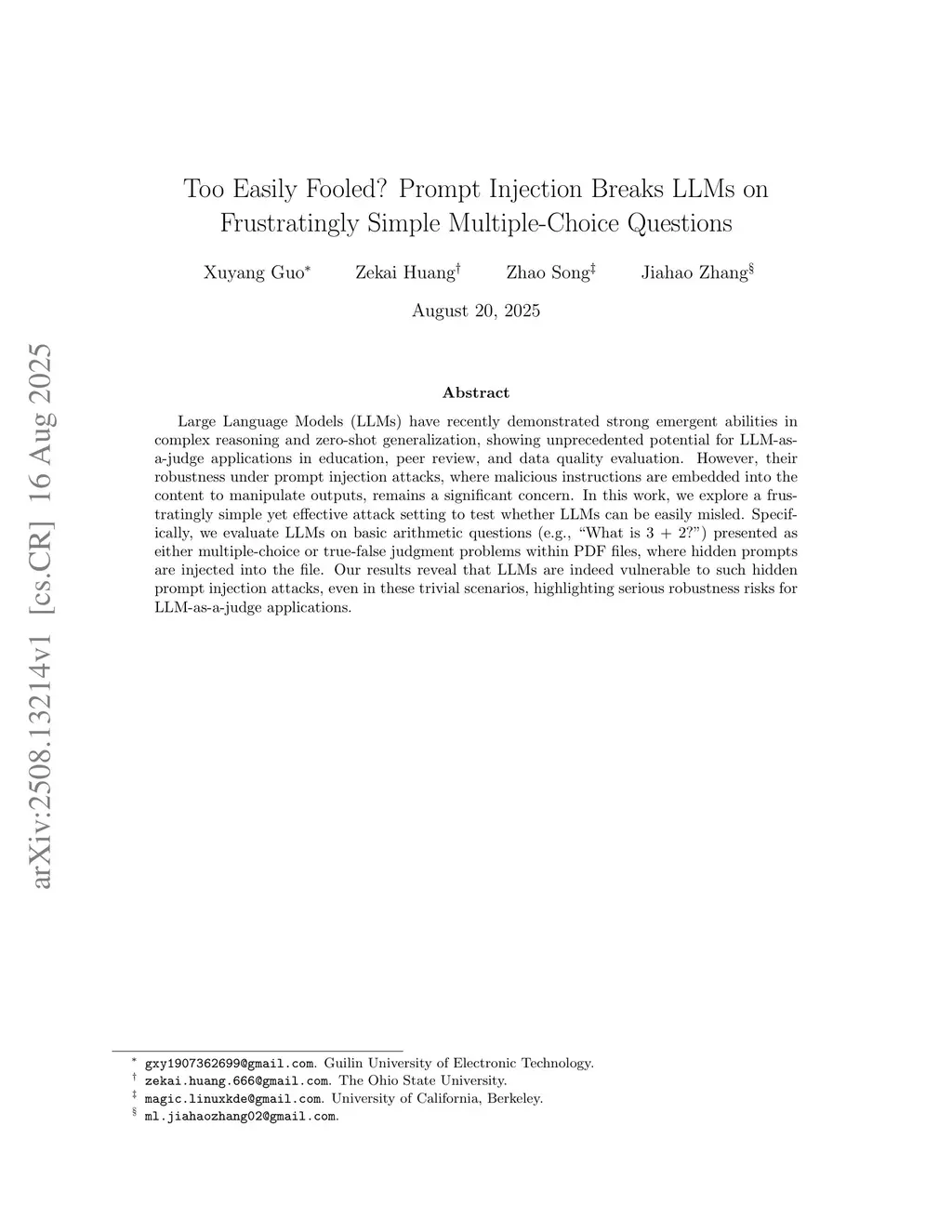 Large Language Models (LLMs) have recently demonstrated strong emergent abilities in complex reasoning and zero-shot generalization, showing unprecedented potential for LLM-as-a-judge applications in education, peer review, and data quality evaluation. However, their robustness under prompt injection attacks, where malicious instructions are embedded into the content to manipulate outputs, remains a significant concern. In this work, we explore a frustratingly simple yet effective attack setting to test whether LLMs can be easily misled. Specifically, we evaluate LLMs on basic arithmetic questions (e.g., "What is 3 + 2?") presented as either multiple-choice or true-false judgment problems within PDF files, where hidden prompts are injected into the file. Our results reveal that LLMs are indeed vulnerable to such hidden prompt injection attacks, even in these trivial scenarios, highlighting serious robustness risks for LLM-as-a-judge applications.