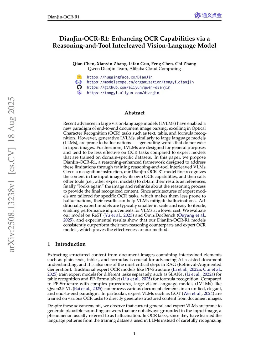Recent advances in vision-language models (VLMs) have enabled end-to-end document parsing and understanding, achieving strong performance on diverse optical character recognition (OCR) tasks. However, VLMs are prone to generate words that do not exist in the input image due to over-reliance on language priors. By contrast, traditional OCR models, whose architectures are tailored for specific recognition tasks, often achieve stronger fine-grained visual perception with fewer hallucinations, but they typically lack the contextual semantic understanding and reasoning capabilities needed in more challenging cases. To bridge this gap, we propose DianJin-OCR-R1, a reasoning-enhanced framework for recognition that trains VLMs in a reasoning-and-tool interleaved paradigm. Our DianJin-OCR-R1 model first recognizes the content in the input image through its own OCR capabilities, and then calls other expert models for extra results as references. After that, it is guided to "look again" at the image and compare its own recognized content with other results to find errors or omissions. Finally, it integrates all available evidence to generate a more accurate output. This design empowers the model to learn how to implicitly re-focus on the visual input and effectively leverage the results of other expert models for better performance. We evaluate our DianJin-OCR-R1 model on ReST and OmniDocBench, where it consistently outperforms both its non-reasoning counterparts and expert models, demonstrating the effectiveness of our method.