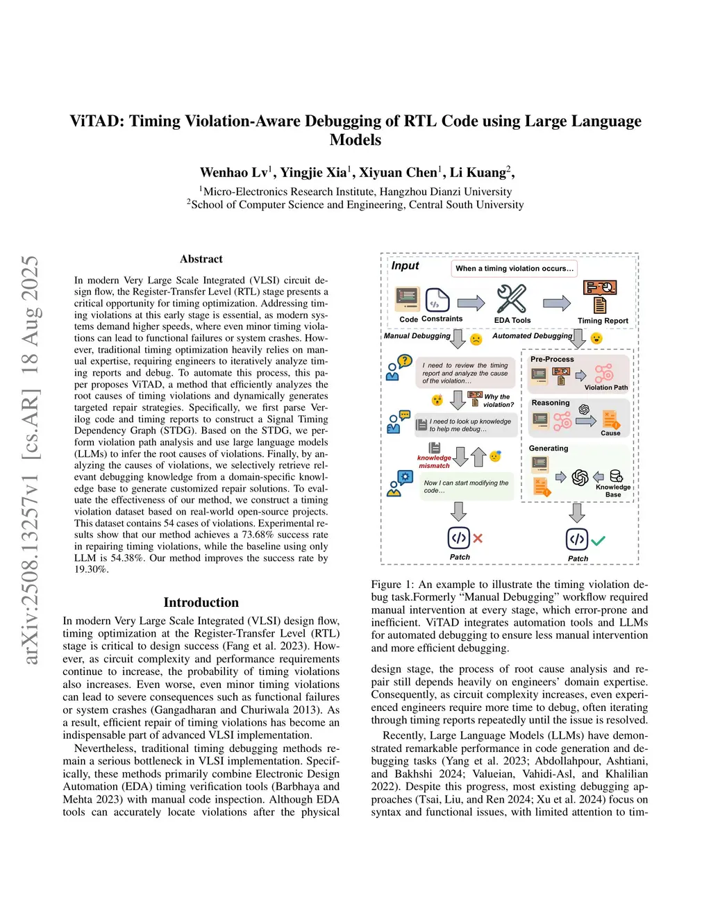 In modern Very Large Scale Integrated (VLSI) circuit design flow, the Register-Transfer Level (RTL) stage presents a critical opportunity for timing optimization. Addressing timing violations at this early stage is essential, as modern systems demand higher speeds, where even minor timing violations can lead to functional failures or system crashes. However, traditional timing optimization heavily relies on manual expertise, requiring engineers to iteratively analyze timing reports and debug. To automate this process, this paper proposes ViTAD, a method that efficiently analyzes the root causes of timing violations and dynamically generates targeted repair strategies. Specifically, we first parse Verilog code and timing reports to construct a Signal Timing Dependency Graph (STDG). Based on the STDG, we perform violation path analysis and use large language models (LLMs) to infer the root causes of violations. Finally, by analyzing the causes of violations, we selectively retrieve relevant debugging knowledge from a domain-specific knowledge base to generate customized repair solutions. To evaluate the effectiveness of our method, we construct a timing violation dataset based on real-world open-source projects. This dataset contains 54 cases of violations. Experimental results show that our method achieves a 73.68% success rate in repairing timing violations, while the baseline using only LLM is 54.38%. Our method improves the success rate by 19.30%.