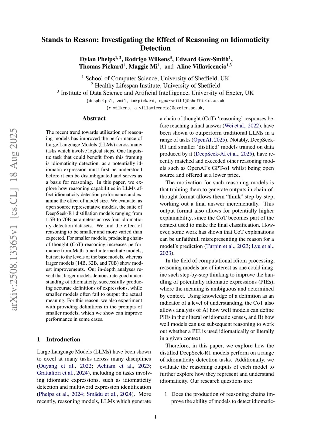 The recent trend towards utilisation of reasoning models has improved the performance of Large Language Models (LLMs) across many tasks which involve logical steps. One linguistic task that could benefit from this framing is idiomaticity detection, as a potentially idiomatic expression must first be understood before it can be disambiguated and serves as a basis for reasoning. In this paper, we explore how reasoning capabilities in LLMs affect idiomaticity detection performance and examine the effect of model size. We evaluate, as open source representative models, the suite of DeepSeek-R1 distillation models ranging from 1.5B to 70B parameters across four idiomaticity detection datasets. We find the effect of reasoning to be smaller and more varied than expected. For smaller models, producing chain-of-thought (CoT) reasoning increases performance from Math-tuned intermediate models, but not to the levels of the base models, whereas larger models (14B, 32B, and 70B) show modest improvements. Our in-depth analyses reveal that larger models demonstrate good understanding of idiomaticity, successfully producing accurate definitions of expressions, while smaller models often fail to output the actual meaning. For this reason, we also experiment with providing definitions in the prompts of smaller models, which we show can improve performance in some cases.