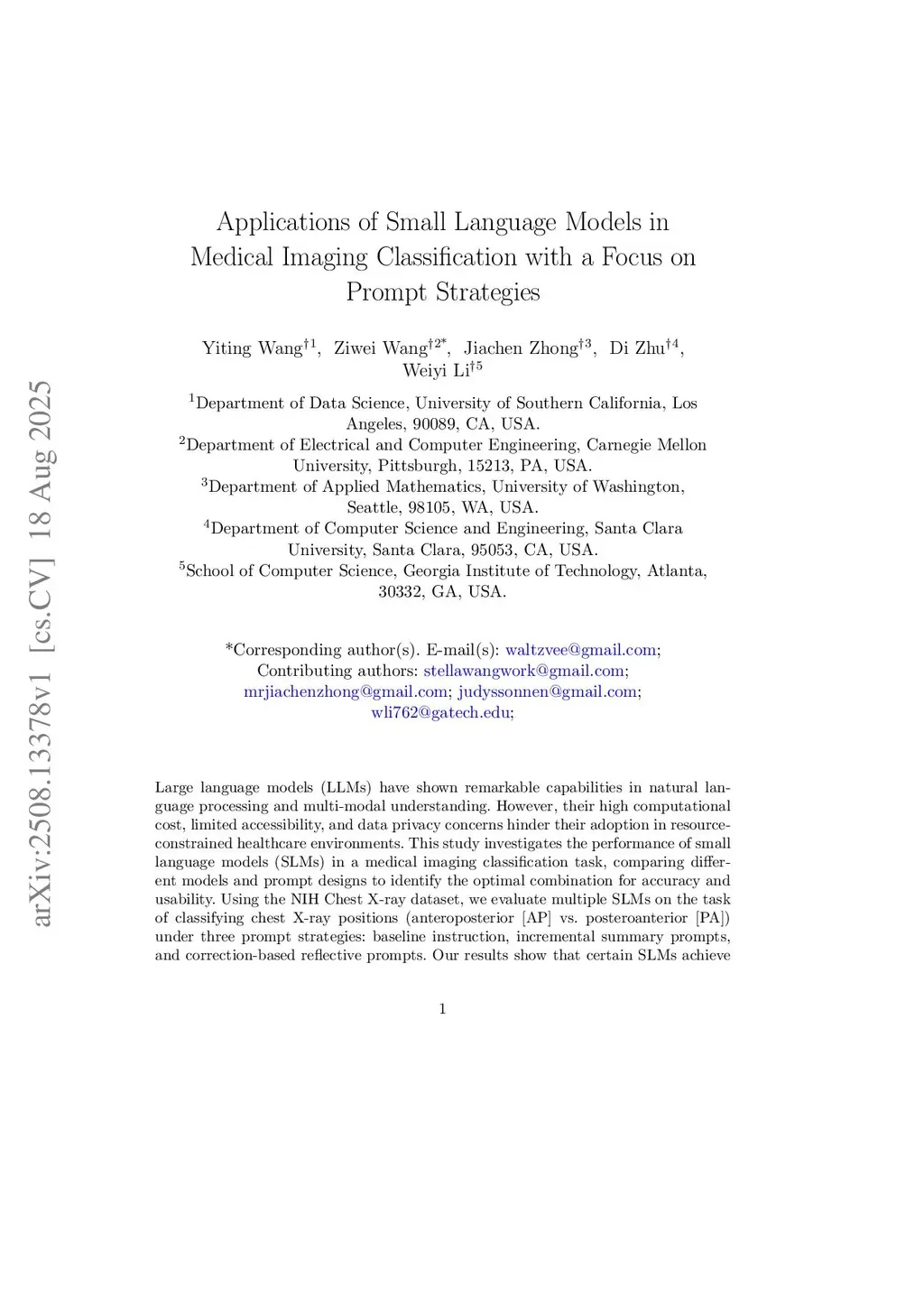 Large language models (LLMs) have shown remarkable capabilities in natural language processing and multi-modal understanding. However, their high computational cost, limited accessibility, and data privacy concerns hinder their adoption in resource-constrained healthcare environments. This study investigates the performance of small language models (SLMs) in a medical imaging classification task, comparing different models and prompt designs to identify the optimal combination for accuracy and usability. Using the NIH Chest X-ray dataset, we evaluate multiple SLMs on the task of classifying chest X-ray positions (anteroposterior [AP] vs. posteroanterior [PA]) under three prompt strategies: baseline instruction, incremental summary prompts, and correction-based reflective prompts. Our results show that certain SLMs achieve competitive accuracy with well-crafted prompts, suggesting that prompt engineering can substantially enhance SLM performance in healthcare applications without requiring deep AI expertise from end users.