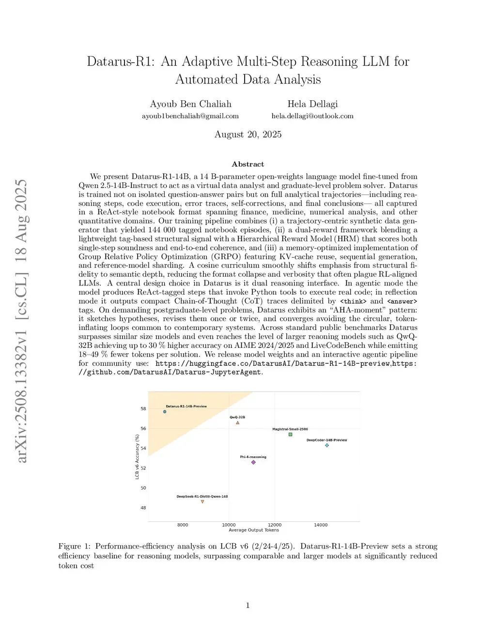 We present Datarus-R1-14B, a 14 B-parameter open-weights language model fine-tuned from Qwen 2.5-14B-Instruct to act as a virtual data analyst and graduate-level problem solver. Datarus is trained not on isolated question-answer pairs but on full analytical trajectories including reasoning steps, code execution, error traces, self-corrections, and final conclusions, all captured in a ReAct-style notebook format spanning finance, medicine, numerical analysis, and other quantitative domains. Our training pipeline combines (i) a trajectory-centric synthetic data generator that yielded 144 000 tagged notebook episodes, (ii) a dual-reward framework blending a lightweight tag-based structural signal with a Hierarchical Reward Model (HRM) that scores both single-step soundness and end-to-end coherence, and (iii) a memory-optimized implementation of Group Relative Policy Optimization (GRPO) featuring KV-cache reuse, sequential generation, and reference-model sharding. A cosine curriculum smoothly shifts emphasis from structural fidelity to semantic depth, reducing the format collapse and verbosity that often plague RL-aligned LLMs. A central design choice in Datarus is it dual reasoning interface. In agentic mode the model produces ReAct-tagged steps that invoke Python tools to execute real code; in reflection mode it outputs compact Chain-of-Thought (CoT) traces delimited by <think> and <answer> tags. On demanding postgraduate-level problems, Datarus exhibits an "AHA-moment" pattern: it sketches hypotheses, revises them once or twice, and converges avoiding the circular, token-inflating loops common to contemporary systems. Across standard public benchmarks Datarus surpasses similar size models and even reaches the level of larger reasoning models such as QwQ-32B achieving up to 30% higher accuracy on AIME 2024/2025 and LiveCodeBench while emitting 18-49% fewer tokens per solution.