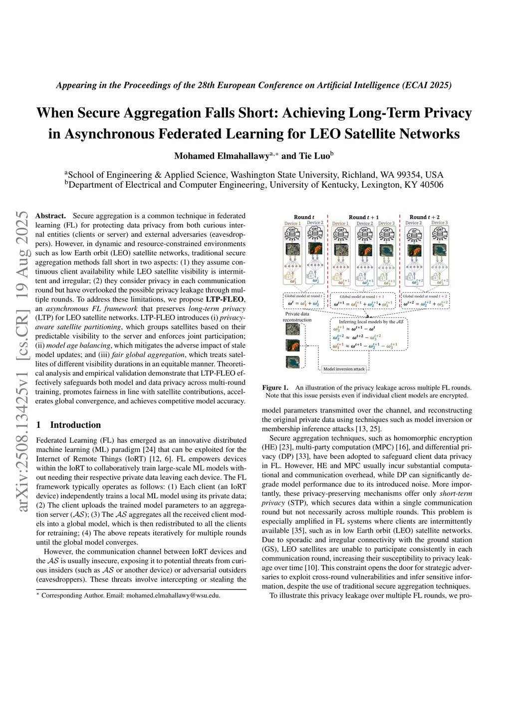 Secure aggregation is a common technique in federated learning (FL) for protecting data privacy from both curious internal entities (clients or server) and external adversaries (eavesdroppers). However, in dynamic and resource-constrained environments such as low Earth orbit (LEO) satellite networks, traditional secure aggregation methods fall short in two aspects: (1) they assume continuous client availability while LEO satellite visibility is intermittent and irregular; (2) they consider privacy in each communication round but have overlooked the possible privacy leakage through multiple rounds. To address these limitations, we propose LTP-FLEO, an asynchronous FL framework that preserves long-term privacy (LTP) for LEO satellite networks. LTP-FLEO introduces (i) privacy-aware satellite partitioning, which groups satellites based on their predictable visibility to the server and enforces joint participation; (ii) model age balancing, which mitigates the adverse impact of stale model updates; and (iii) fair global aggregation, which treats satellites of different visibility durations in an equitable manner. Theoretical analysis and empirical validation demonstrate that LTP-FLEO effectively safeguards both model and data privacy across multi-round training, promotes fairness in line with satellite contributions, accelerates global convergence, and achieves competitive model accuracy.