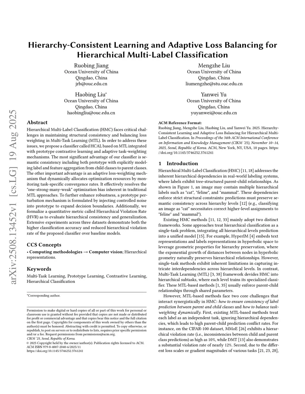 Hierarchical Multi-Label Classification (HMC) faces critical challenges in maintaining structural consistency and balancing loss weighting in Multi-Task Learning (MTL). In order to address these issues, we propose a classifier called HCAL based on MTL integrated with prototype contrastive learning and adaptive task-weighting mechanisms. The most significant advantage of our classifier is semantic consistency including both prototype with explicitly modeling label and feature aggregation from child classes to parent classes. The other important advantage is an adaptive loss-weighting mechanism that dynamically allocates optimization resources by monitoring task-specific convergence rates. It effectively resolves the "one-strong-many-weak" optimization bias inherent in traditional MTL approaches. To further enhance robustness, a prototype perturbation mechanism is formulated by injecting controlled noise into prototype to expand decision boundaries. Additionally, we formalize a quantitative metric called Hierarchical Violation Rate (HVR) as to evaluate hierarchical consistency and generalization. Extensive experiments across three datasets demonstrate both the higher classification accuracy and reduced hierarchical violation rate of the proposed classifier over baseline models.