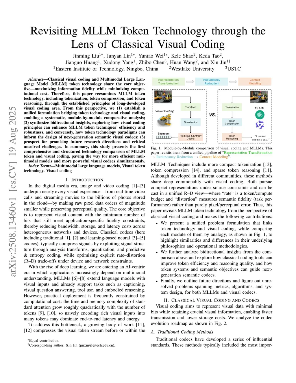 Classical visual coding and Multimodal Large Language Model (MLLM) token technology share the core objective - maximizing information fidelity while minimizing computational cost. Therefore, this paper reexamines MLLM token technology, including tokenization, token compression, and token reasoning, through the established principles of long-developed visual coding area. From this perspective, we (1) establish a unified formulation bridging token technology and visual coding, enabling a systematic, module-by-module comparative analysis; (2) synthesize bidirectional insights, exploring how visual coding principles can enhance MLLM token techniques' efficiency and robustness, and conversely, how token technology paradigms can inform the design of next-generation semantic visual codecs; (3) prospect for promising future research directions and critical unsolved challenges. In summary, this study presents the first comprehensive and structured technology comparison of MLLM token and visual coding, paving the way for more efficient multimodal models and more powerful visual codecs simultaneously.