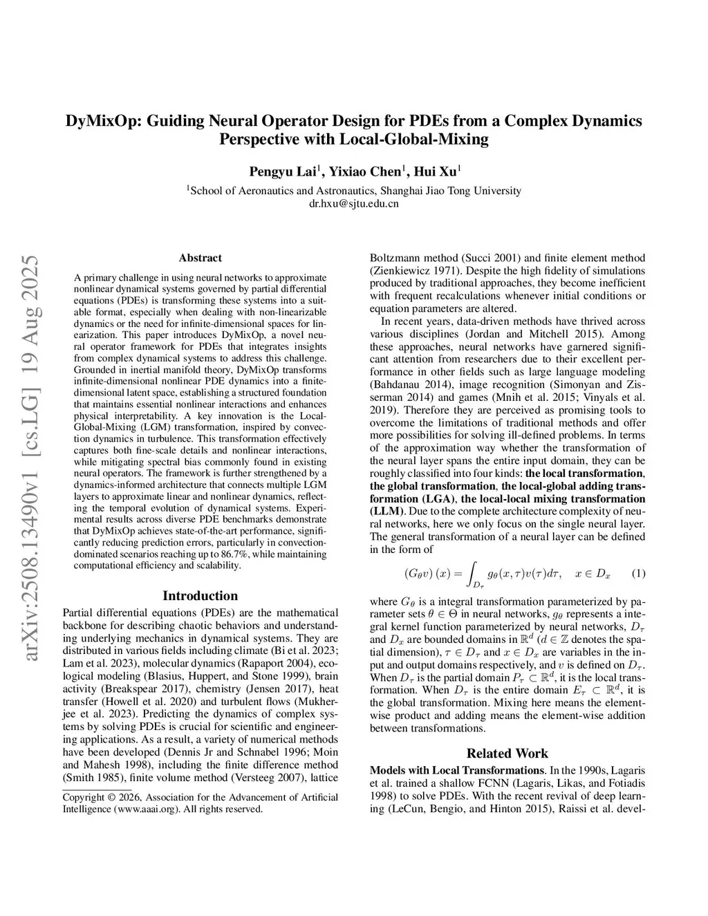 A primary challenge in using neural networks to approximate nonlinear dynamical systems governed by partial differential equations (PDEs) is transforming these systems into a suitable format, especially when dealing with non-linearizable dynamics or the need for infinite-dimensional spaces for linearization. This paper introduces DyMixOp, a novel neural operator framework for PDEs that integrates insights from complex dynamical systems to address this challenge. Grounded in inertial manifold theory, DyMixOp transforms infinite-dimensional nonlinear PDE dynamics into a finite-dimensional latent space, establishing a structured foundation that maintains essential nonlinear interactions and enhances physical interpretability. A key innovation is the Local-Global-Mixing (LGM) transformation, inspired by convection dynamics in turbulence. This transformation effectively captures both fine-scale details and nonlinear interactions, while mitigating spectral bias commonly found in existing neural operators. The framework is further strengthened by a dynamics-informed architecture that connects multiple LGM layers to approximate linear and nonlinear dynamics, reflecting the temporal evolution of dynamical systems. Experimental results across diverse PDE benchmarks demonstrate that DyMixOp achieves state-of-the-art performance, significantly reducing prediction errors, particularly in convection-dominated scenarios reaching up to 86.7\%, while maintaining computational efficiency and scalability.
