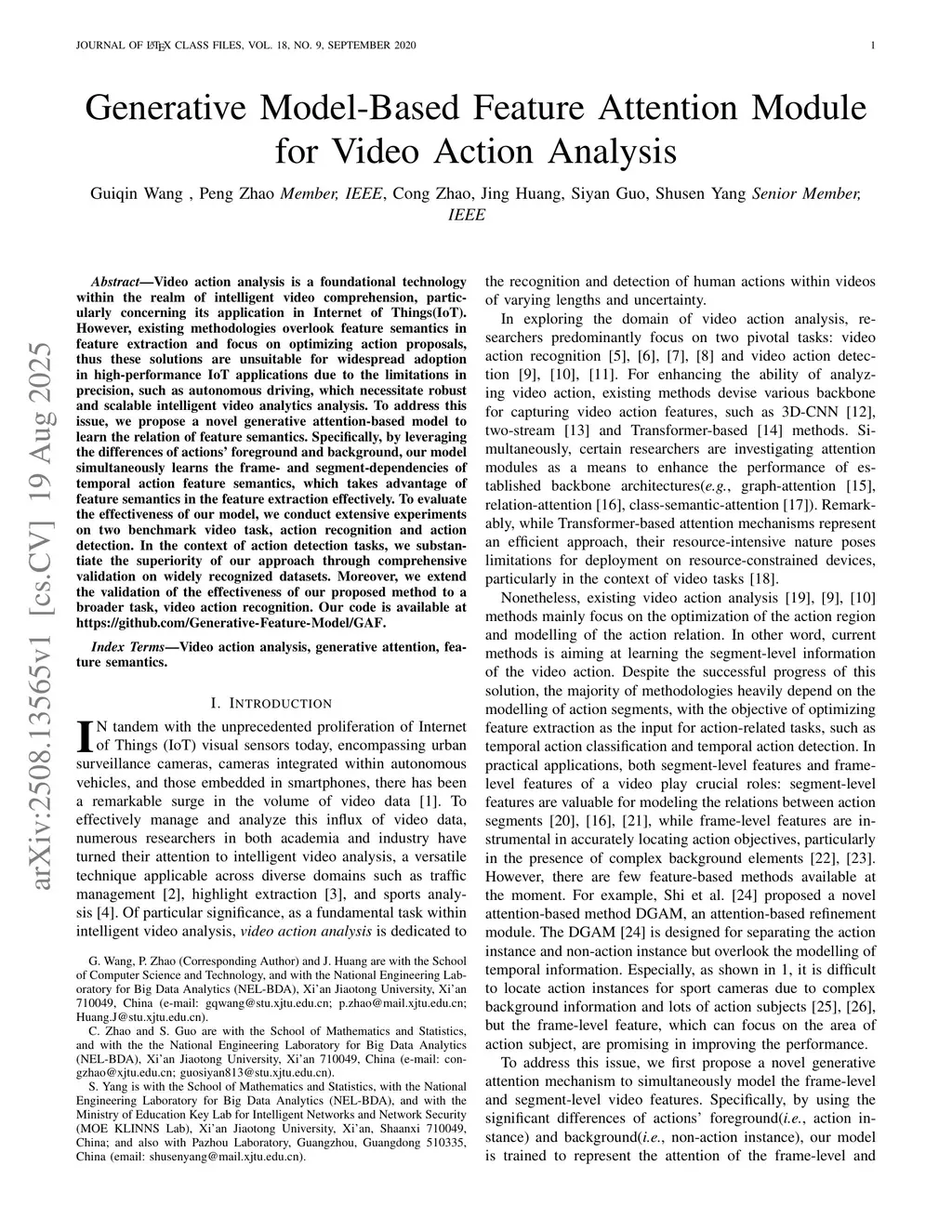Video action analysis is a foundational technology within the realm of intelligent video comprehension, particularly concerning its application in Internet of Things(IoT). However, existing methodologies overlook feature semantics in feature extraction and focus on optimizing action proposals, thus these solutions are unsuitable for widespread adoption in high-performance IoT applications due to the limitations in precision, such as autonomous driving, which necessitate robust and scalable intelligent video analytics analysis. To address this issue, we propose a novel generative attention-based model to learn the relation of feature semantics. Specifically, by leveraging the differences of actions' foreground and background, our model simultaneously learns the frame- and segment-dependencies of temporal action feature semantics, which takes advantage of feature semantics in the feature extraction effectively. To evaluate the effectiveness of our model, we conduct extensive experiments on two benchmark video task, action recognition and action detection. In the context of action detection tasks, we substantiate the superiority of our approach through comprehensive validation on widely recognized datasets. Moreover, we extend the validation of the effectiveness of our proposed method to a broader task, video action recognition. Our code is available atthis https URL.