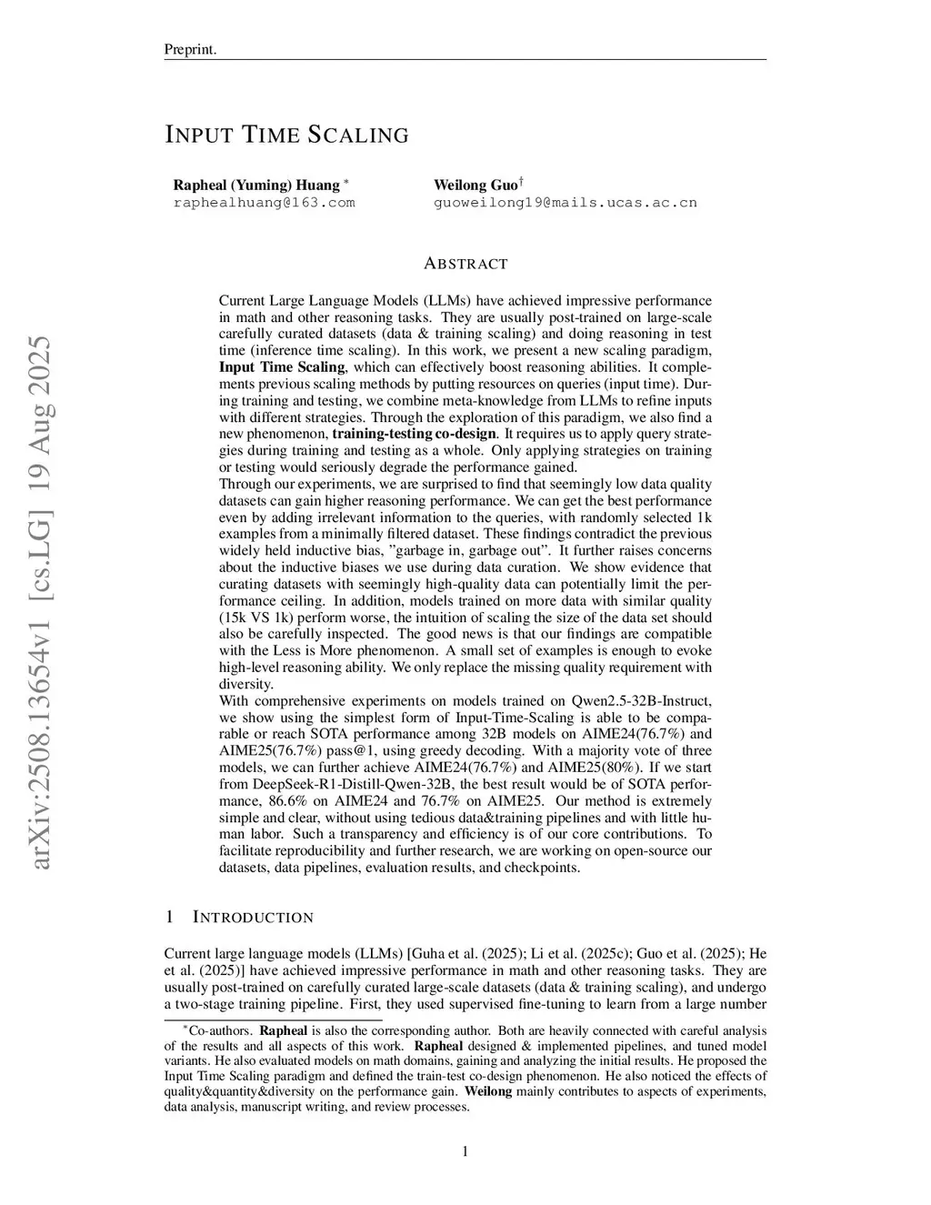 Large Language Models (LLMs) excel at reasoning, traditionally requiring high-quality large-scale data and extensive training. Recent works reveal a very appealing Less-Is-More phenomenon where very small, carefully curated high-quality datasets match resource-intensive approaches. In this work, we further systematically relax their quality constraints by adding controlled noise via persona context relevance and comparing datasets of different qualities. Counterintuitively, we find that mixing relevant and irrelevant contexts consistently across training and inference stages yields optimal results -- a phenomenon we term training-testing co-design. Dataset quality comparisons show that high-quality data benefits weaker models on easy questions, while low-quality data achieves higher scores on hard questions with capable models. Across our experiments, reasoning performance is linked to reasoning efficiency. We, for the first time, found adding noisy and irrelevant contexts into queries can improve reasoning efficiency without any prices and targeted designs. Building on these insights, we propose Input-Time Scaling: applying small, low-quality data to capable models with training-testing co-design. This maintains Less-Is-More while further removing labor-intensive quality curation and improving reasoning effectiveness and efficiency, making the approach more applicable and affordable. Our method achieves 76.7% pass@1 on AIME24/25 using Qwen2.5-32B-Instruct, and 90.0%/80.0% with DeepSeek-R1-Distill-Qwen-32B -- state-of-the-art among Qwen2.5-32B variants. We are open-sourcing our datasets, pipelines, evaluation results, and checkpoints to facilitate reproducibility and further research.