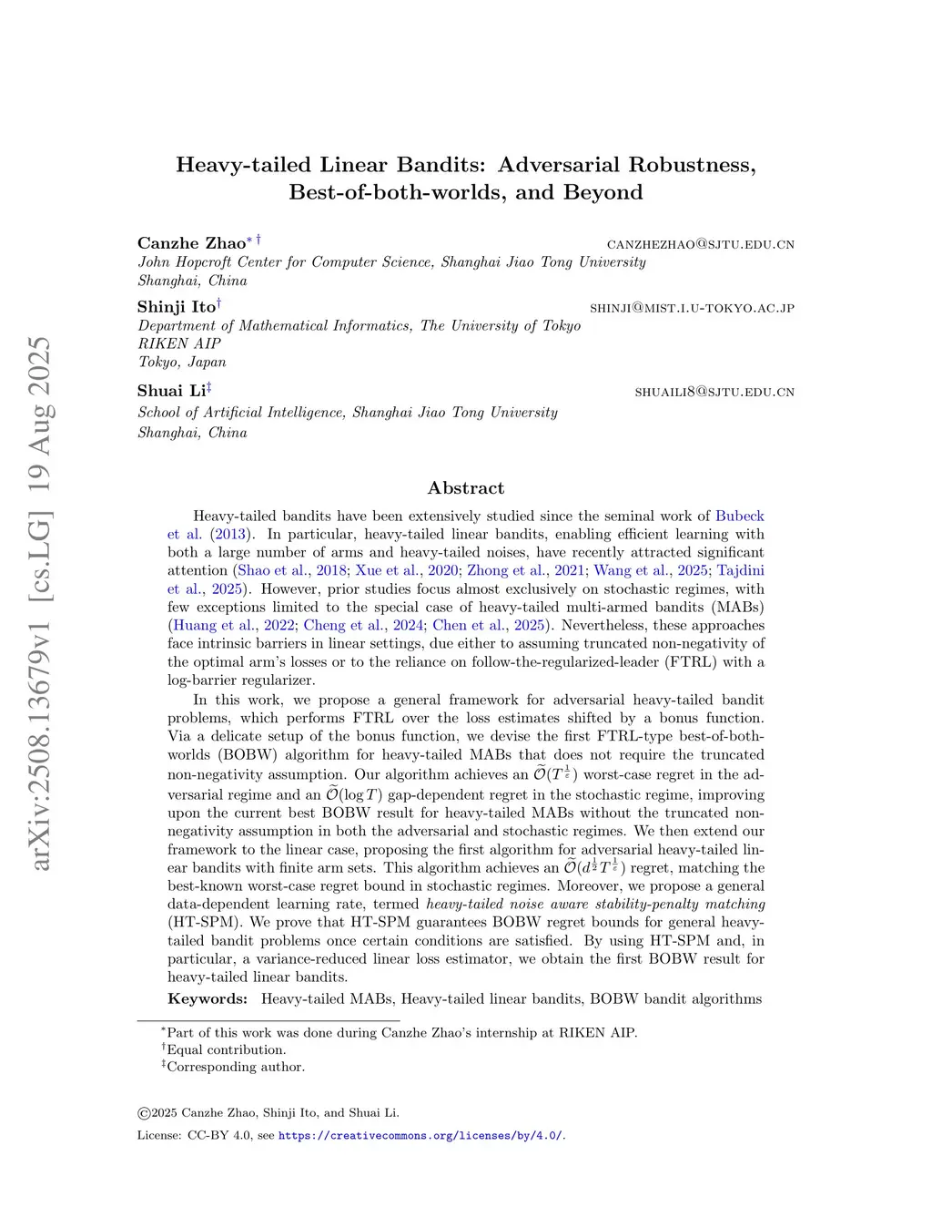 Heavy-tailed bandits have been extensively studied since the seminal work of \citet{Bubeck2012BanditsWH}. In particular, heavy-tailed linear bandits, enabling efficient learning with both a large number of arms and heavy-tailed noises, have recently attracted significant attention \citep{ShaoYKL18,XueWWZ20,ZhongHYW21,Wang2025heavy,tajdini2025improved}. However, prior studies focus almost exclusively on stochastic regimes, with few exceptions limited to the special case of heavy-tailed multi-armed bandits (MABs) \citep{Huang0H22,ChengZ024,Chen2024uniINF}.In this work, we propose a general framework for adversarial heavy-tailed bandit problems, which performs follow-the-regularized-leader (FTRL) over the loss estimates shifted by a bonus function. Via a delicate setup of the bonus function, we devise the first FTRL-type best-of-both-worlds (BOBW) algorithm for heavy-tailed MABs, which does not require the truncated non-negativity assumption and achieves an worst-case regret in the adversarial regime as well as an gap-dependent regret in the stochastic regime. We then extend our framework to the linear case, proposing the first algorithm for adversarial heavy-tailed linear bandits with finite arm sets. This algorithm achieves an regret, matching the best-known worst-case regret bound in stochastic regimes. Moreover, we propose a general data-dependent learning rate, termed \textit{heavy-tailed noise aware stability-penalty matching} (HT-SPM). We prove that HT-SPM guarantees BOBW regret bounds for general heavy-tailed bandit problems once certain conditions are satisfied. By using HT-SPM and, in particular, a variance-reduced linear loss estimator, we obtain the first BOBW result for heavy-tailed linear bandits.