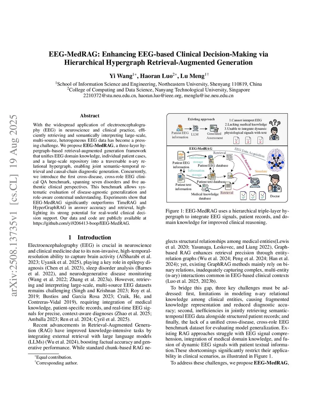 With the widespread application of electroencephalography (EEG) in neuroscience and clinical practice, efficiently retrieving and semantically interpreting large-scale, multi-source, heterogeneous EEG data has become a pressing challenge. We propose EEG-MedRAG, a three-layer hypergraph-based retrieval-augmented generation framework that unifies EEG domain knowledge, individual patient cases, and a large-scale repository into a traversable n-ary relational hypergraph, enabling joint semantic-temporal retrieval and causal-chain diagnostic generation. Concurrently, we introduce the first cross-disease, cross-role EEG clinical QA benchmark, spanning seven disorders and five authentic clinical perspectives. This benchmark allows systematic evaluation of disease-agnostic generalization and role-aware contextual understanding. Experiments show that EEG-MedRAG significantly outperforms TimeRAG and HyperGraphRAG in answer accuracy and retrieval, highlighting its strong potential for real-world clinical decision support. Our data and code are publicly available atthis https URL.