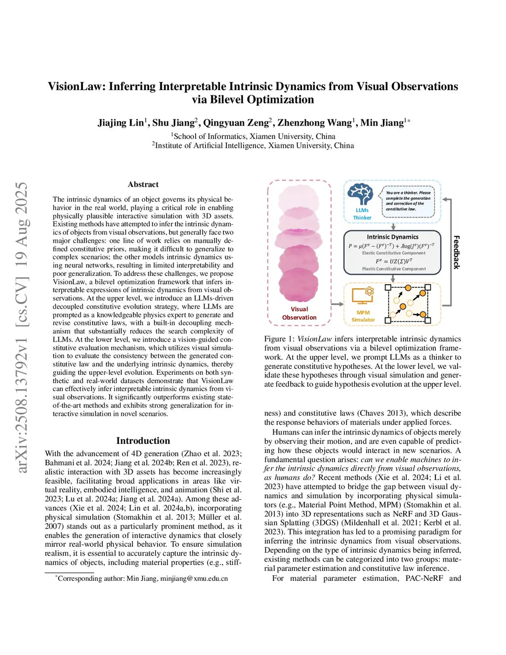 The intrinsic dynamics of an object governs its physical behavior in the real world, playing a critical role in enabling physically plausible interactive simulation with 3D assets. Existing methods have attempted to infer the intrinsic dynamics of objects from visual observations, but generally face two major challenges: one line of work relies on manually defined constitutive priors, making it difficult to generalize to complex scenarios; the other models intrinsic dynamics using neural networks, resulting in limited interpretability and poor generalization. To address these challenges, we propose VisionLaw, a bilevel optimization framework that infers interpretable expressions of intrinsic dynamics from visual observations. At the upper level, we introduce an LLMs-driven decoupled constitutive evolution strategy, where LLMs are prompted as a knowledgeable physics expert to generate and revise constitutive laws, with a built-in decoupling mechanism that substantially reduces the search complexity of LLMs. At the lower level, we introduce a vision-guided constitutive evaluation mechanism, which utilizes visual simulation to evaluate the consistency between the generated constitutive law and the underlying intrinsic dynamics, thereby guiding the upper-level evolution. Experiments on both synthetic and real-world datasets demonstrate that VisionLaw can effectively infer interpretable intrinsic dynamics from visual observations. It significantly outperforms existing state-of-the-art methods and exhibits strong generalization for interactive simulation in novel scenarios.