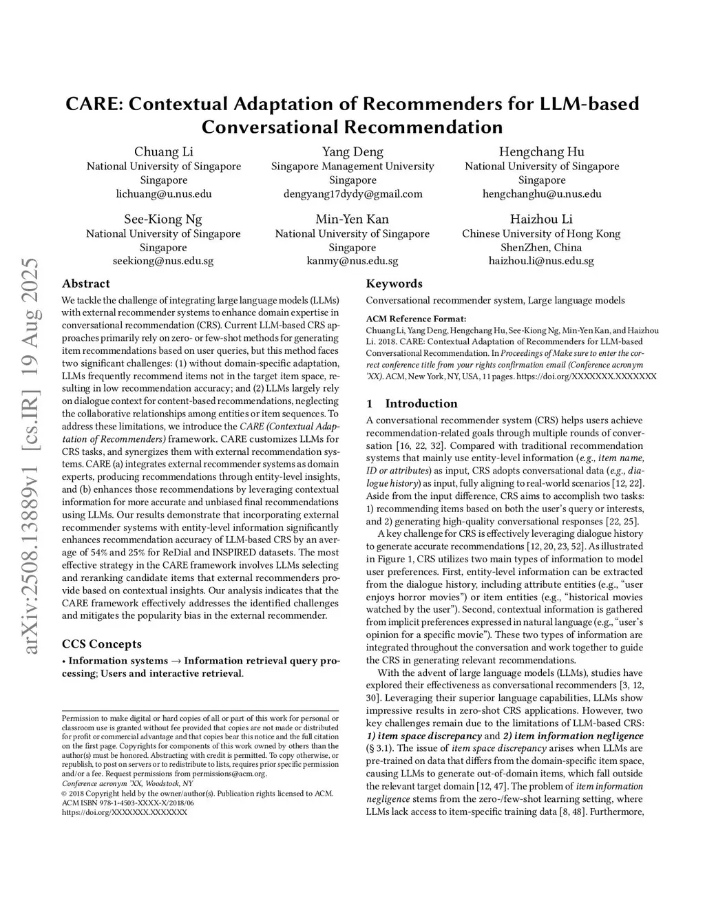 CARE: Contextual Adaptation of Recommenders for LLM-based Conversational Recommendation