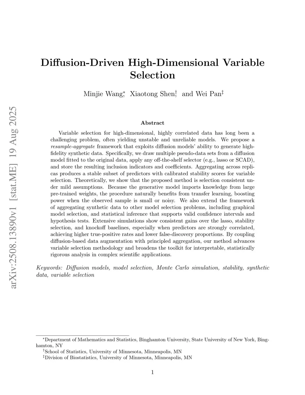Variable selection for high-dimensional, highly correlated data has long been a challenging problem, often yielding unstable and unreliable models. We propose a resample-aggregate framework that exploits diffusion models' ability to generate high-fidelity synthetic data. Specifically, we draw multiple pseudo-data sets from a diffusion model fitted to the original data, apply any off-the-shelf selector (e.g., lasso or SCAD), and store the resulting inclusion indicators and coefficients. Aggregating across replicas produces a stable subset of predictors with calibrated stability scores for variable selection. Theoretically, we show that the proposed method is selection consistent under mild assumptions. Because the generative model imports knowledge from large pre-trained weights, the procedure naturally benefits from transfer learning, boosting power when the observed sample is small or noisy. We also extend the framework of aggregating synthetic data to other model selection problems, including graphical model selection, and statistical inference that supports valid confidence intervals and hypothesis tests. Extensive simulations show consistent gains over the lasso, stability selection, and knockoff baselines, especially when predictors are strongly correlated, achieving higher true-positive rates and lower false-discovery proportions. By coupling diffusion-based data augmentation with principled aggregation, our method advances variable selection methodology and broadens the toolkit for interpretable, statistically rigorous analysis in complex scientific applications.