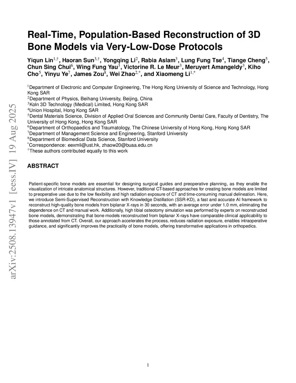 Patient-specific bone models are essential for designing surgical guides and preoperative planning, as they enable the visualization of intricate anatomical structures. However, traditional CT-based approaches for creating bone models are limited to preoperative use due to the low flexibility and high radiation exposure of CT and time-consuming manual delineation. Here, we introduce Semi-Supervised Reconstruction with Knowledge Distillation (SSR-KD), a fast and accurate AI framework to reconstruct high-quality bone models from biplanar X-rays in 30 seconds, with an average error under 1.0 mm, eliminating the dependence on CT and manual work. Additionally, high tibial osteotomy simulation was performed by experts on reconstructed bone models, demonstrating that bone models reconstructed from biplanar X-rays have comparable clinical applicability to those annotated from CT. Overall, our approach accelerates the process, reduces radiation exposure, enables intraoperative guidance, and significantly improves the practicality of bone models, offering transformative applications in orthopedics.