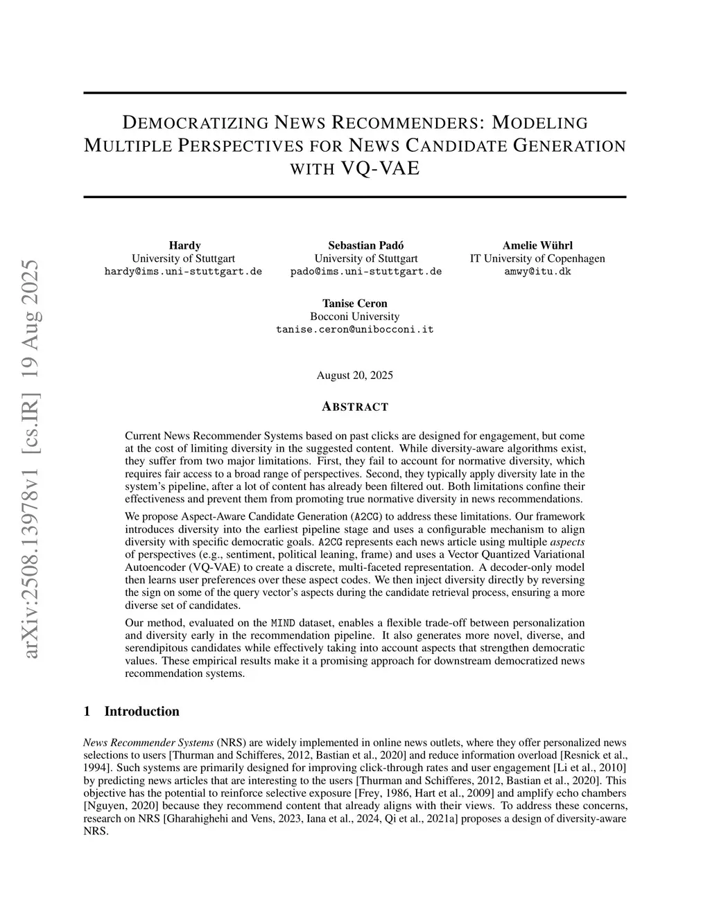 Democratizing News Recommenders: Modeling Multiple Perspectives for News Candidate Generation with VQ-VAE