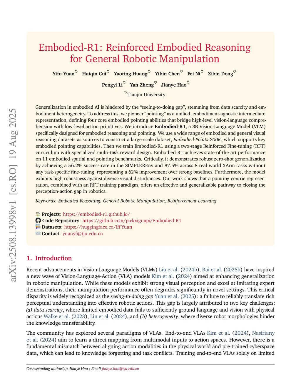 Generalization in embodied AI is hindered by the "seeing-to-doing gap," which stems from data scarcity and embodiment heterogeneity. To address this, we pioneer "pointing" as a unified, embodiment-agnostic intermediate representation, defining four core embodied pointing abilities that bridge high-level vision-language comprehension with low-level action primitives. We introduce Embodied-R1, a 3B Vision-Language Model (VLM) specifically designed for embodied reasoning and pointing. We use a wide range of embodied and general visual reasoning datasets as sources to construct a large-scale dataset, Embodied-Points-200K, which supports key embodied pointing capabilities. We then train Embodied-R1 using a two-stage Reinforced Fine-tuning (RFT) curriculum with a specialized multi-task reward design. Embodied-R1 achieves state-of-the-art performance on 11 embodied spatial and pointing benchmarks. Critically, it demonstrates robust zero-shot generalization by achieving a 56.2% success rate in the SIMPLEREnv and 87.5% across 8 real-world XArm tasks without any task-specific fine-tuning, representing a 62% improvement over strong baselines. Furthermore, the model exhibits high robustness against diverse visual disturbances. Our work shows that a pointing-centric representation, combined with an RFT training paradigm, offers an effective and generalizable pathway to closing the perception-action gap in robotics.