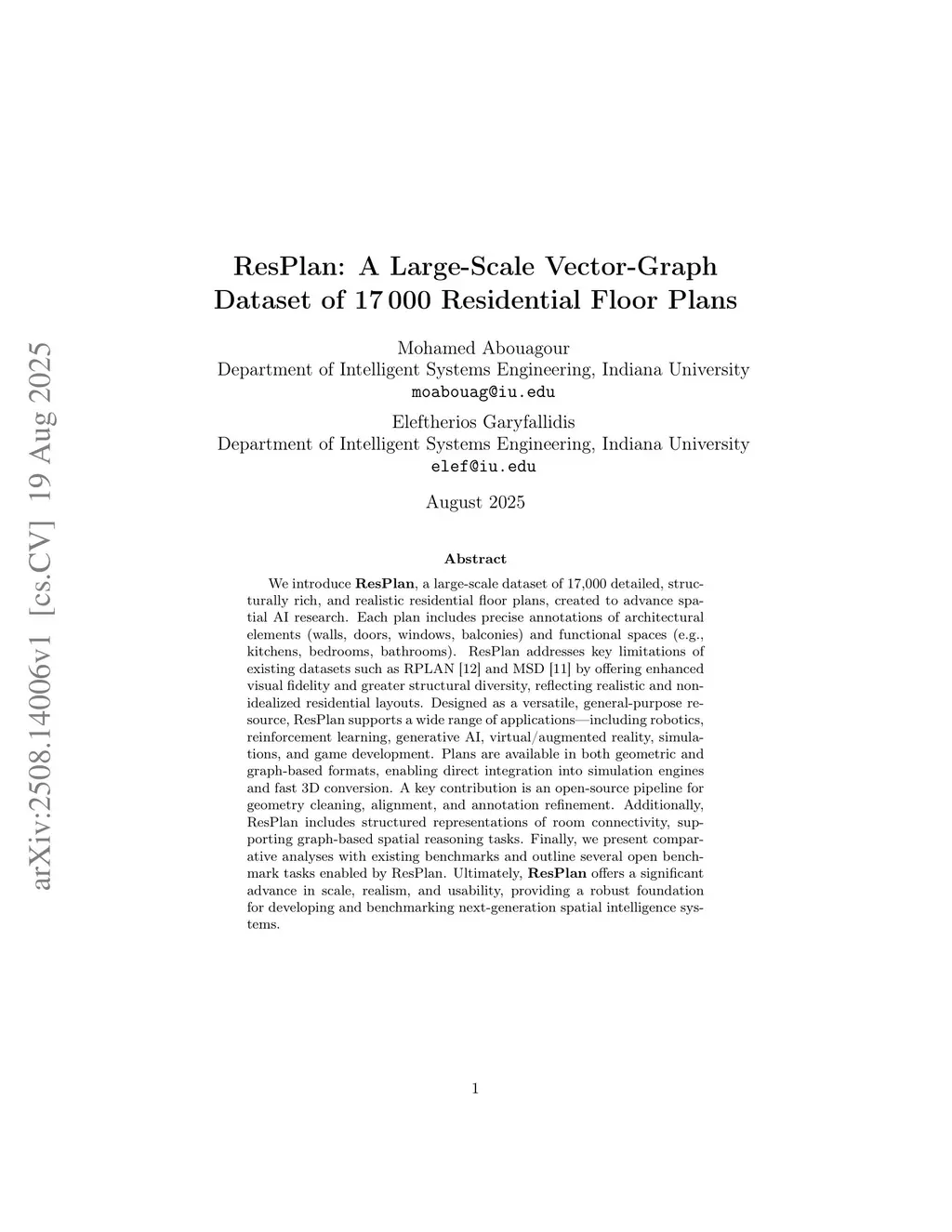 We introduce ResPlan, a large-scale dataset of 17,000 detailed, structurally rich, and realistic residential floor plans, created to advance spatial AI research. Each plan includes precise annotations of architectural elements (walls, doors, windows, balconies) and functional spaces (such as kitchens, bedrooms, and bathrooms). ResPlan addresses key limitations of existing datasets such as RPLAN (Wu et al., 2019) and MSD (van Engelenburg et al., 2024) by offering enhanced visual fidelity and greater structural diversity, reflecting realistic and non-idealized residential layouts. Designed as a versatile, general-purpose resource, ResPlan supports a wide range of applications including robotics, reinforcement learning, generative AI, virtual and augmented reality, simulations, and game development. Plans are provided in both geometric and graph-based formats, enabling direct integration into simulation engines and fast 3D conversion. A key contribution is an open-source pipeline for geometry cleaning, alignment, and annotation refinement. Additionally, ResPlan includes structured representations of room connectivity, supporting graph-based spatial reasoning tasks. Finally, we present comparative analyses with existing benchmarks and outline several open benchmark tasks enabled by ResPlan. Ultimately, ResPlan offers a significant advance in scale, realism, and usability, providing a robust foundation for developing and benchmarking next-generation spatial intelligence systems.