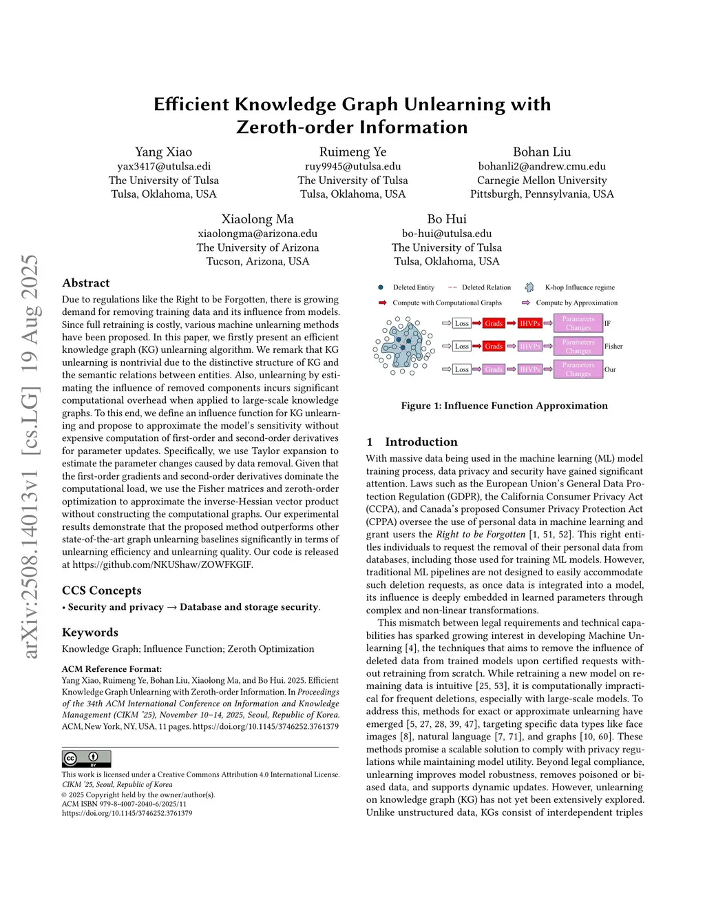 Due to regulations like the Right to be Forgotten, there is growing demand for removing training data and its influence from models. Since full retraining is costly, various machine unlearning methods have been proposed. In this paper, we firstly present an efficient knowledge graph (KG) unlearning algorithm. We remark that KG unlearning is nontrivial due to the distinctive structure of KG and the semantic relations between entities. Also, unlearning by estimating the influence of removed components incurs significant computational overhead when applied to large-scale knowledge graphs. To this end, we define an influence function for KG unlearning and propose to approximate the model's sensitivity without expensive computation of first-order and second-order derivatives for parameter updates. Specifically, we use Taylor expansion to estimate the parameter changes caused by data removal. Given that the first-order gradients and second-order derivatives dominate the computational load, we use the Fisher matrices and zeroth-order optimization to approximate the inverse-Hessian vector product without constructing the computational graphs. Our experimental results demonstrate that the proposed method outperforms other state-of-the-art graph unlearning baselines significantly in terms of unlearning efficiency and unlearning quality. Our code is released atthis https URL.