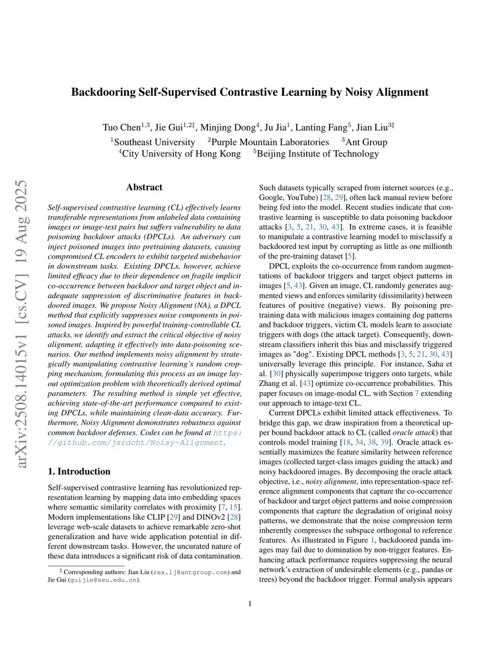 Backdooring Self-Supervised Contrastive Learning by Noisy Alignment