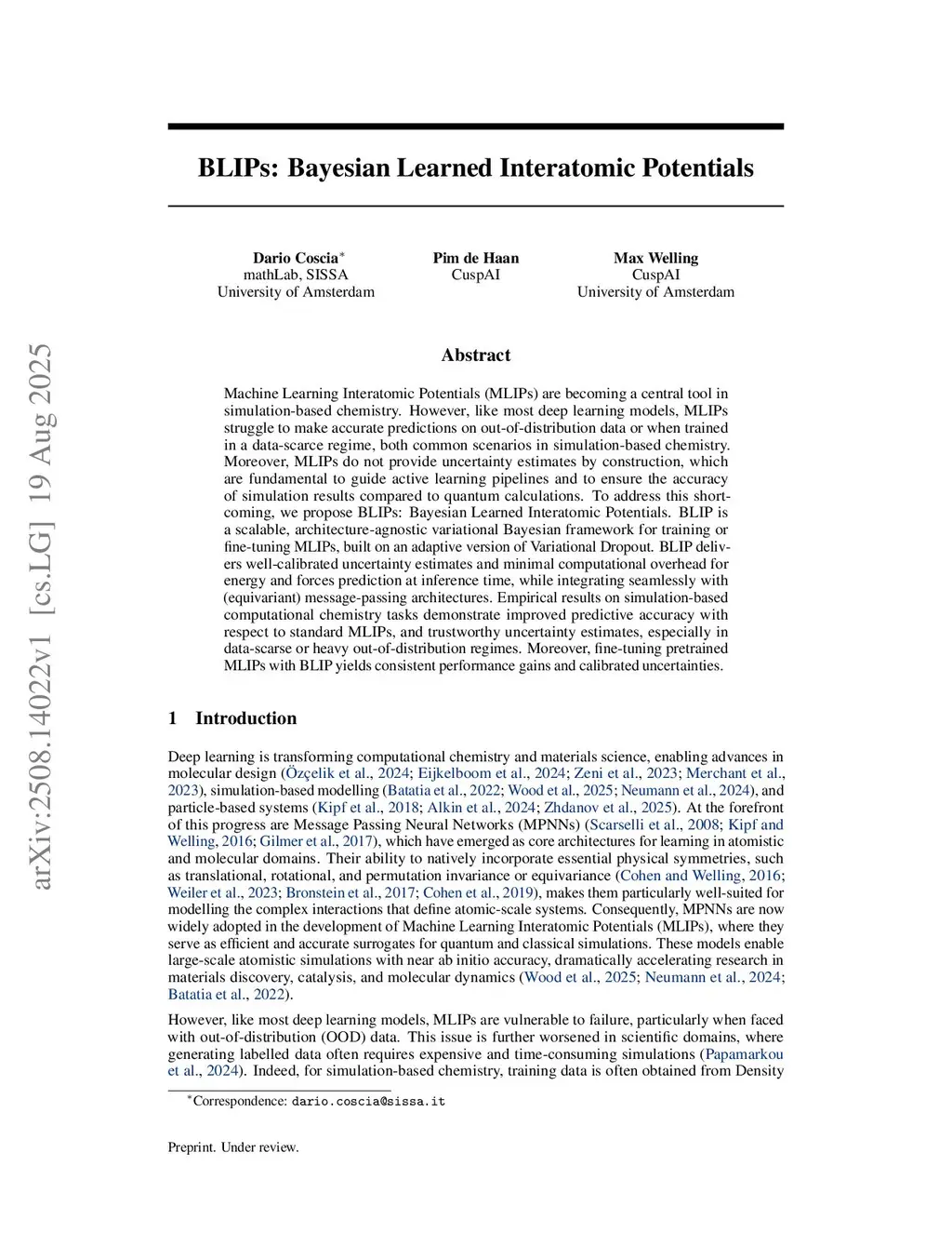 Machine Learning Interatomic Potentials (MLIPs) are becoming a central tool in simulation-based chemistry. However, like most deep learning models, MLIPs struggle to make accurate predictions on out-of-distribution data or when trained in a data-scarce regime, both common scenarios in simulation-based chemistry. Moreover, MLIPs do not provide uncertainty estimates by construction, which are fundamental to guide active learning pipelines and to ensure the accuracy of simulation results compared to quantum calculations. To address this shortcoming, we propose BLIPs: Bayesian Learned Interatomic Potentials. BLIP is a scalable, architecture-agnostic variational Bayesian framework for training or fine-tuning MLIPs, built on an adaptive version of Variational Dropout. BLIP delivers well-calibrated uncertainty estimates and minimal computational overhead for energy and forces prediction at inference time, while integrating seamlessly with (equivariant) message-passing architectures. Empirical results on simulation-based computational chemistry tasks demonstrate improved predictive accuracy with respect to standard MLIPs, and trustworthy uncertainty estimates, especially in data-scarse or heavy out-of-distribution regimes. Moreover, fine-tuning pretrained MLIPs with BLIP yields consistent performance gains and calibrated uncertainties.