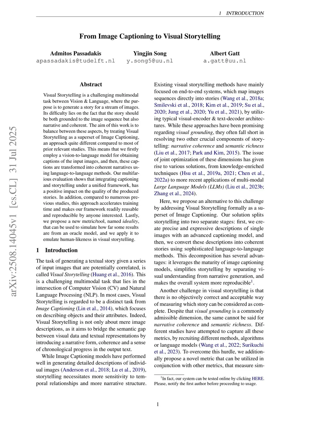 Visual Storytelling is a challenging multimodal task between Vision & Language, where the purpose is to generate a story for a stream of images. Its difficulty lies on the fact that the story should be both grounded to the image sequence but also narrative and coherent. The aim of this work is to balance between these aspects, by treating Visual Storytelling as a superset of Image Captioning, an approach quite different compared to most of prior relevant studies. This means that we firstly employ a vision-to-language model for obtaining captions of the input images, and then, these captions are transformed into coherent narratives using language-to-language methods. Our multifarious evaluation shows that integrating captioning and storytelling under a unified framework, has a positive impact on the quality of the produced stories. In addition, compared to numerous previous studies, this approach accelerates training time and makes our framework readily reusable and reproducible by anyone interested. Lastly, we propose a new metric/tool, named ideality, that can be used to simulate how far some results are from an oracle model, and we apply it to emulate human-likeness in visual storytelling.