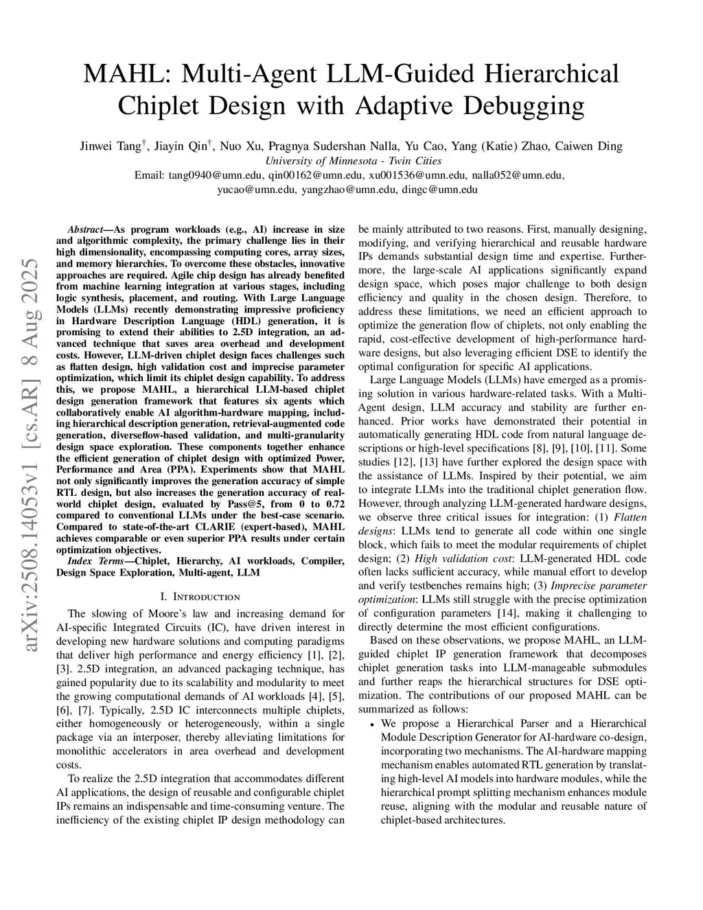 As program workloads (e.g., AI) increase in size and algorithmic complexity, the primary challenge lies in their high dimensionality, encompassing computing cores, array sizes, and memory hierarchies. To overcome these obstacles, innovative approaches are required. Agile chip design has already benefited from machine learning integration at various stages, including logic synthesis, placement, and routing. With Large Language Models (LLMs) recently demonstrating impressive proficiency in Hardware Description Language (HDL) generation, it is promising to extend their abilities to 2.5D integration, an advanced technique that saves area overhead and development costs. However, LLM-driven chiplet design faces challenges such as flatten design, high validation cost and imprecise parameter optimization, which limit its chiplet design capability. To address this, we propose MAHL, a hierarchical LLM-based chiplet design generation framework that features six agents which collaboratively enable AI algorithm-hardware mapping, including hierarchical description generation, retrieval-augmented code generation, diverseflow-based validation, and multi-granularity design space exploration. These components together enhance the efficient generation of chiplet design with optimized Power, Performance and Area (PPA). Experiments show that MAHL not only significantly improves the generation accuracy of simple RTL design, but also increases the generation accuracy of real-world chiplet design, evaluated by Pass@5, from 0 to 0.72 compared to conventional LLMs under the best-case scenario. Compared to state-of-the-art CLARIE (expert-based), MAHL achieves comparable or even superior PPA results under certain optimization objectives.