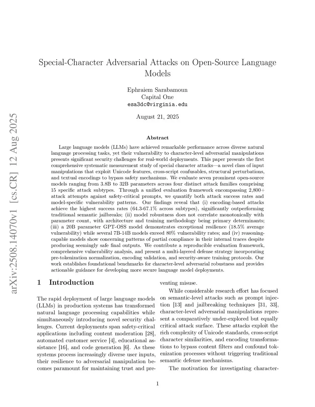 Special-Character Adversarial Attacks on Open-Source Language Model