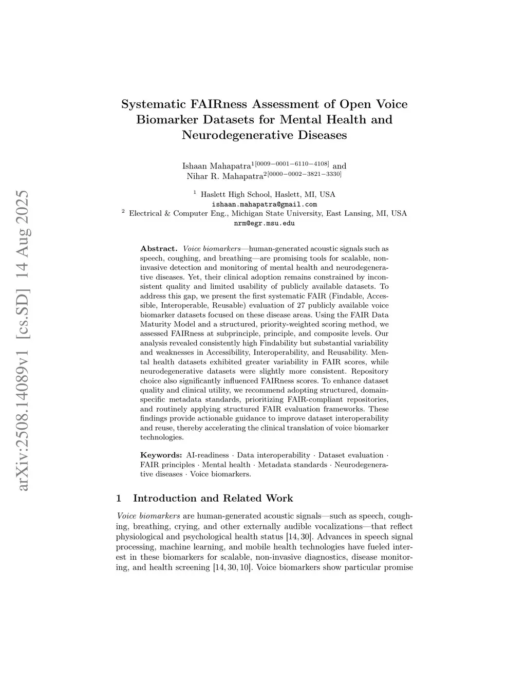 Voice biomarkers--human-generated acoustic signals such as speech, coughing, and breathing--are promising tools for scalable, non-invasive detection and monitoring of mental health and neurodegenerative diseases. Yet, their clinical adoption remains constrained by inconsistent quality and limited usability of publicly available datasets. To address this gap, we present the first systematic FAIR (Findable, Accessible, Interoperable, Reusable) evaluation of 27 publicly available voice biomarker datasets focused on these disease areas. Using the FAIR Data Maturity Model and a structured, priority-weighted scoring method, we assessed FAIRness at subprinciple, principle, and composite levels. Our analysis revealed consistently high Findability but substantial variability and weaknesses in Accessibility, Interoperability, and Reusability. Mental health datasets exhibited greater variability in FAIR scores, while neurodegenerative datasets were slightly more consistent. Repository choice also significantly influenced FAIRness scores. To enhance dataset quality and clinical utility, we recommend adopting structured, domain-specific metadata standards, prioritizing FAIR-compliant repositories, and routinely applying structured FAIR evaluation frameworks. These findings provide actionable guidance to improve dataset interoperability and reuse, thereby accelerating the clinical translation of voice biomarker technologies.