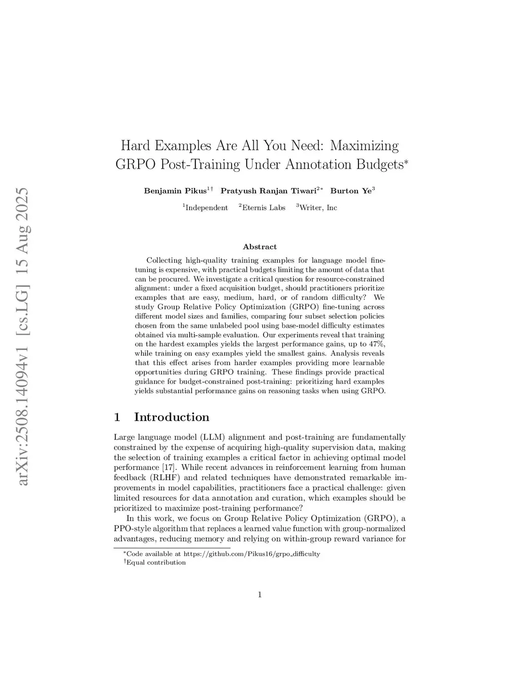 Collecting high-quality training examples for language model fine-tuning is expensive, with practical budgets limiting the amount of data that can be procured. We investigate whether example difficulty affects GRPO training effectiveness by comparing selection strategies (easy, medium, hard, random) across multiple models and reasoning tasks. Training on the hardest 10\% of examples (those where the base model fails most often) yields dramatic performance gains up to 47\%, while easy examples produce minimal improvements of 3-15\%. This occurs because GRPO requires outcome variance to generate learning signals; hard examples maintain mixed success/failure outcomes throughout training while easy examples quickly converge to consistent success, eliminating learning opportunities. Moreover, models trained on hard examples show superior out-of-distribution generalization, with only hard-trained models achieving meaningful gains on the AIME2025 benchmark. Our findings provide clear guidance: when budget-constrained, prioritize collecting and annotating examples where your base model struggles, as these drive nearly all learning value in GRPO fine-tuning